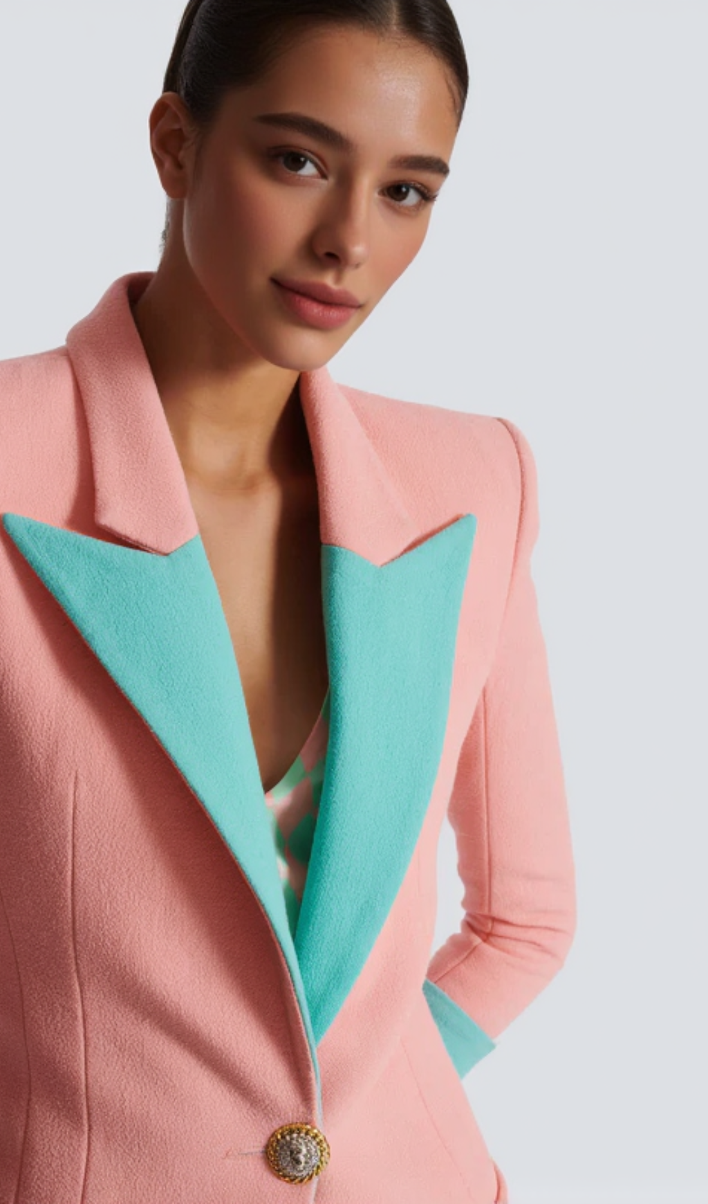 • Tailored collar with contrasting peak lapels
