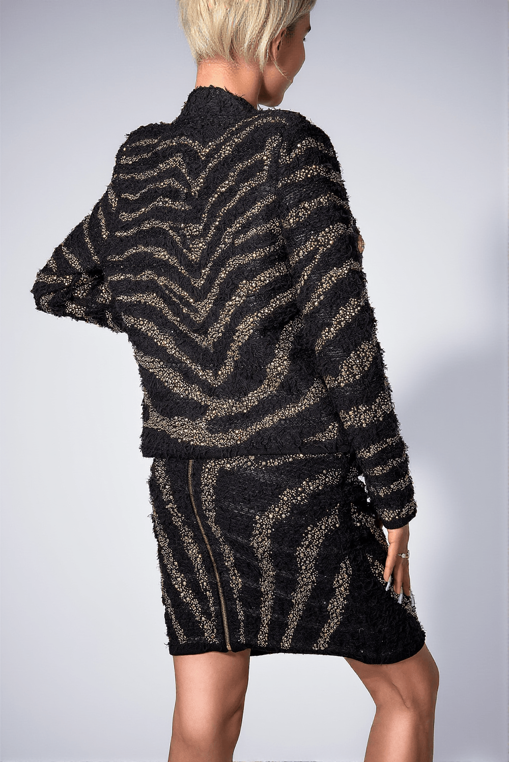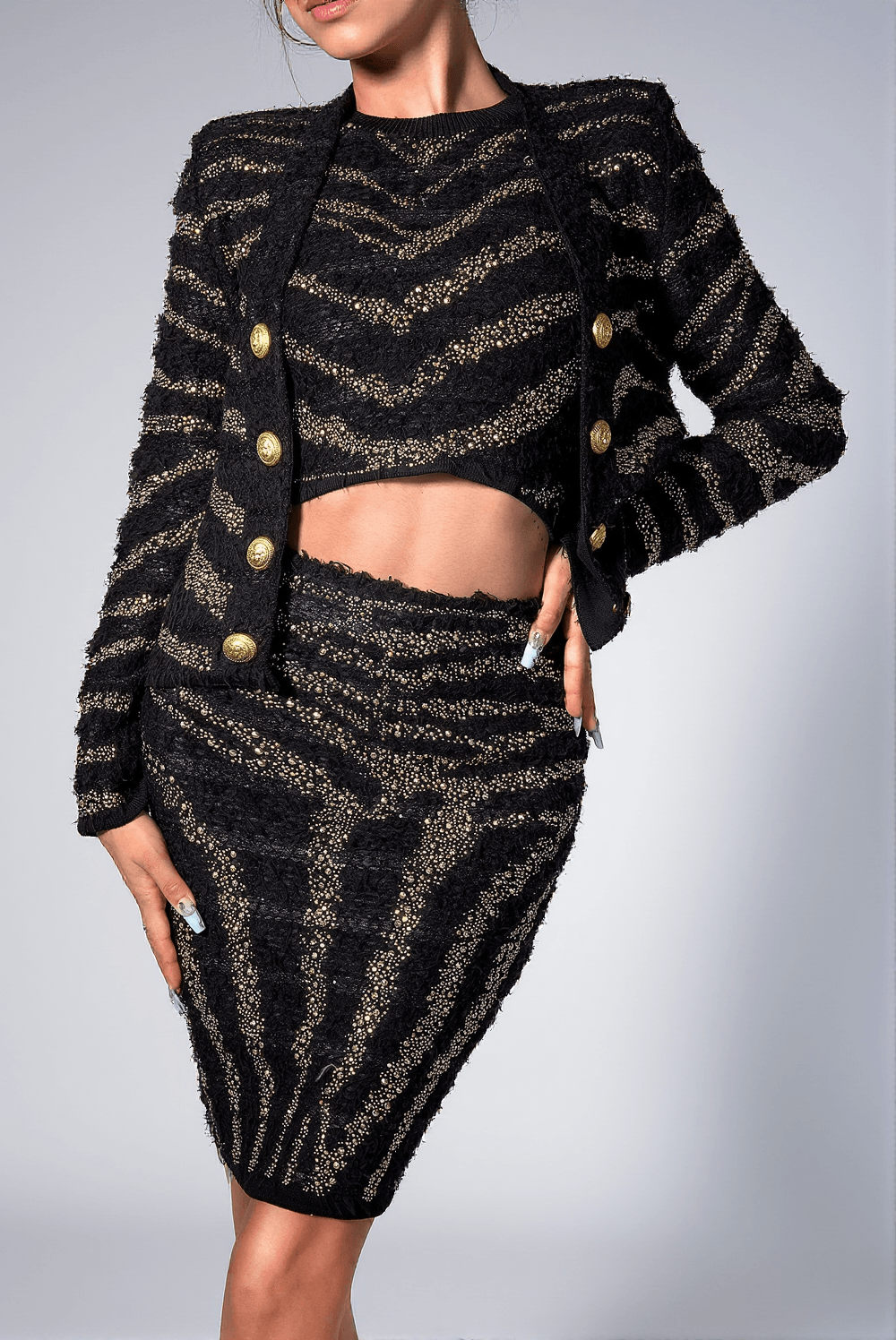The blazer's unique stripe pattern adds a modern twist to traditional elegance, making it a standout piece for any event. Each button is adorned with sparkling rhinestones, adding an extra touch of glamour and luxury.