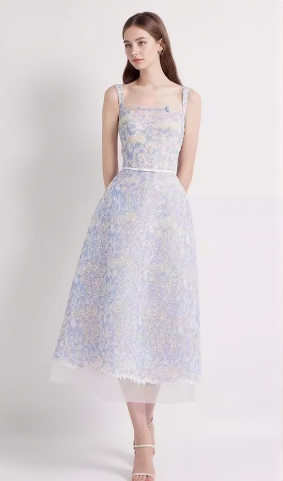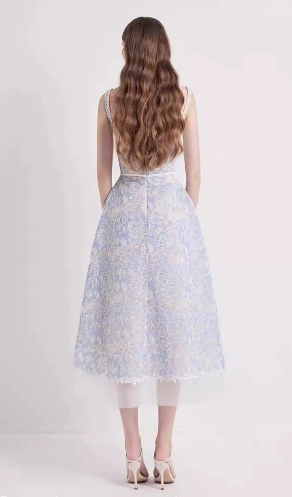 A-LINE SQUARE NECK EMBROIDERED LACE MIDI DRESS IN BLUE