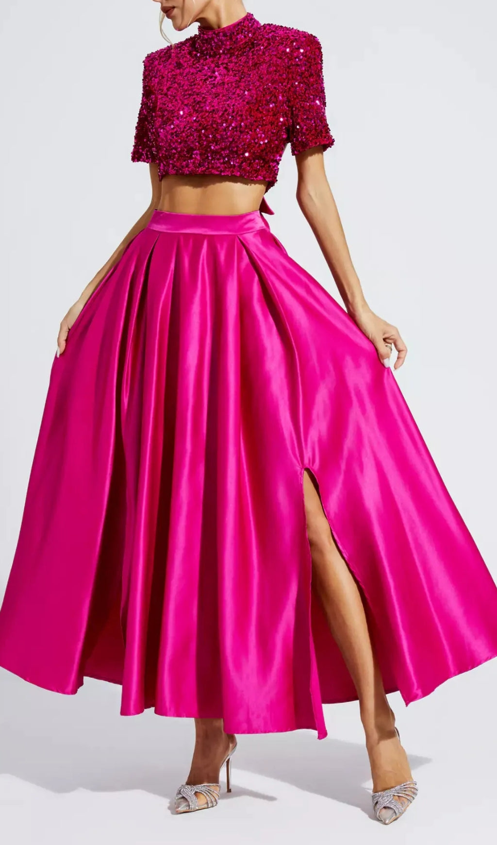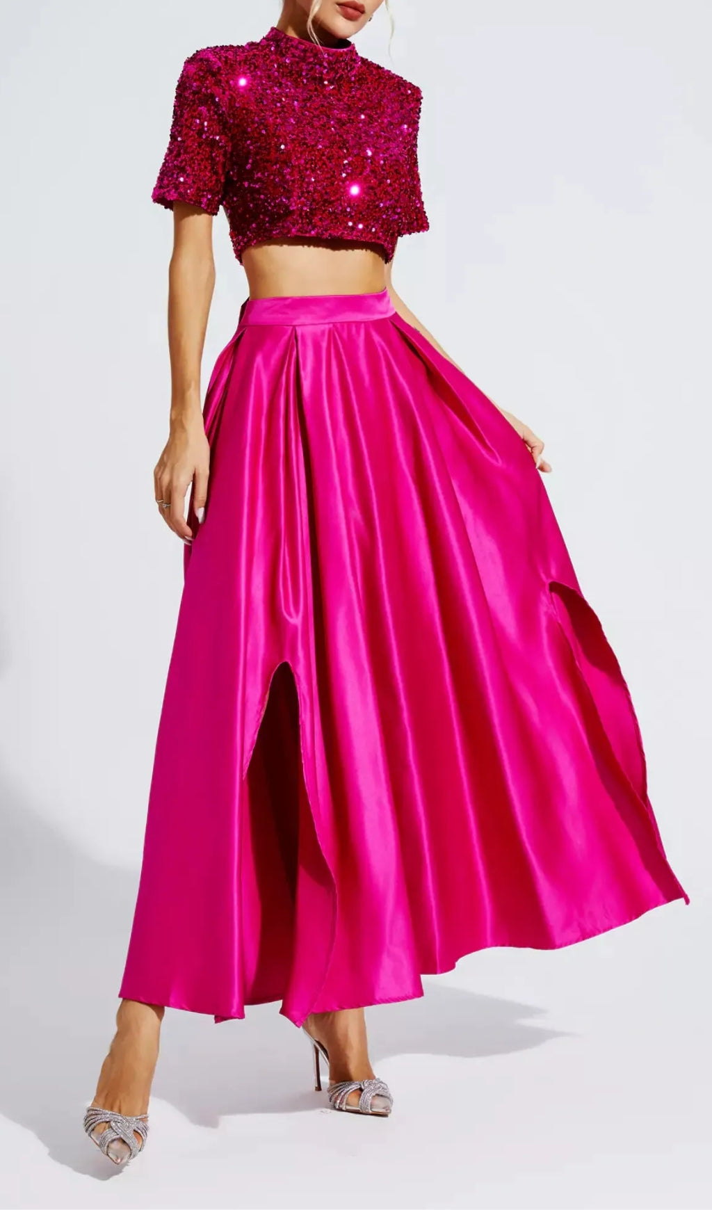 Such eye-catching beauty! You'll be the center of attention in our Aisha Rose Red Sequin Bow Lace-up Set. A sequined bow crop top paired with a slit skirt makes this outfit unique. Whether it's a cocktail party, an important social occasion, or a coming-of-age ceremony, this stylish piece can add elegance to you. Complete the look with heels and sparkly accessories.