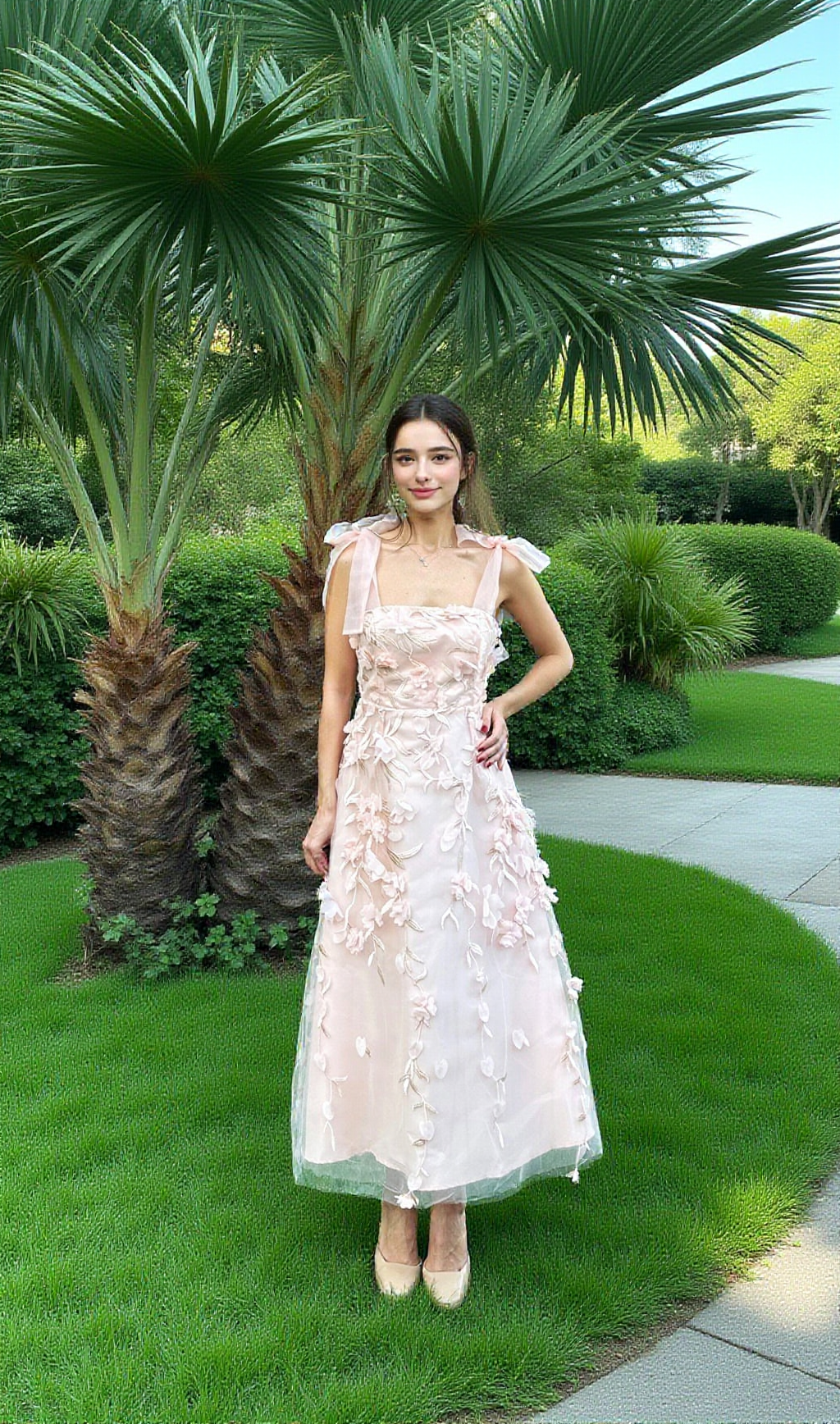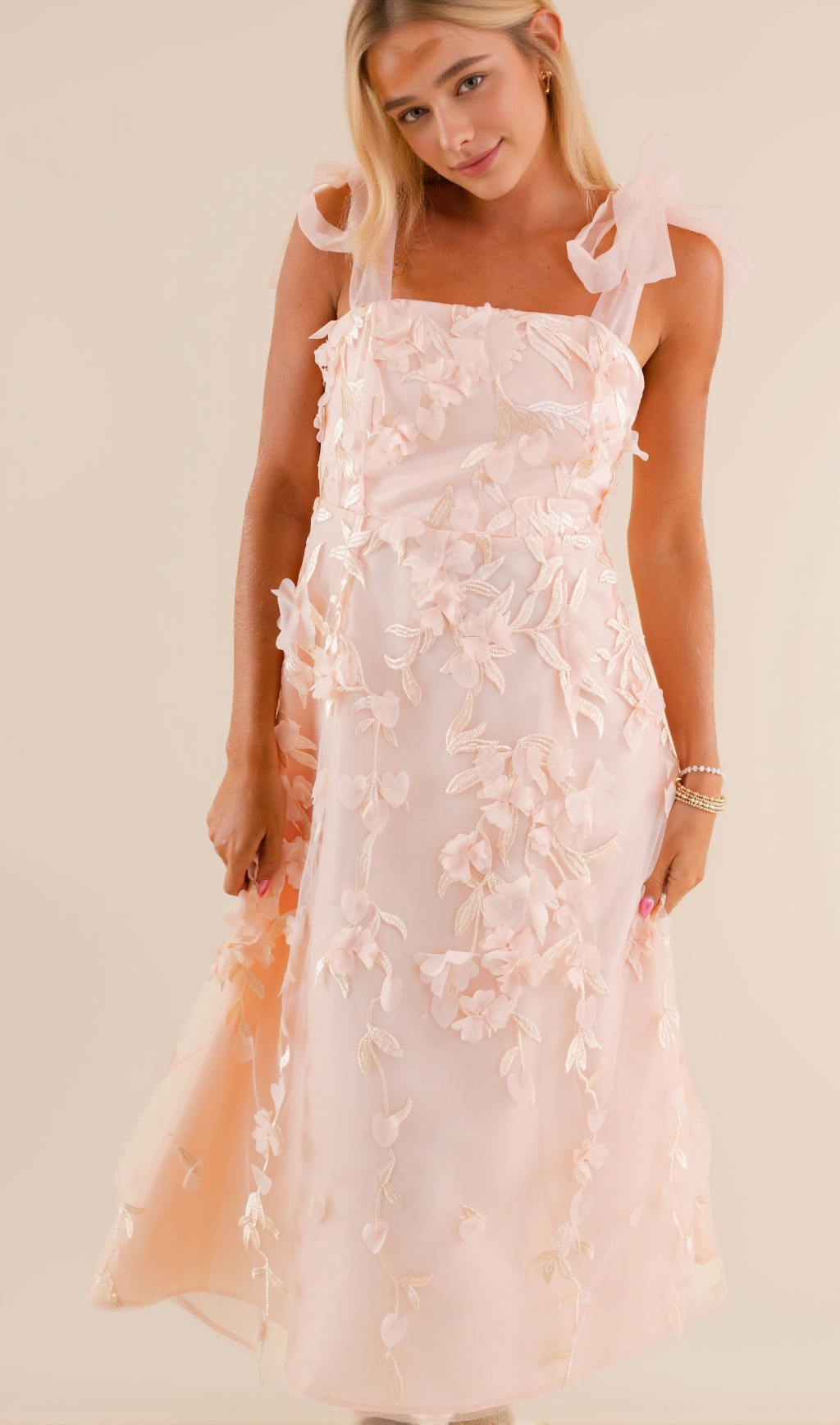 Feel like absolute royalty in our Absolute Elegance 3D Flower Midi Dress! The blush pink floral embroidery and tulle ribbon self-tie straps add an elegant touch, while the fitted waist and A-line skirt flatter your figure. The hidden back zipper ensures a seamless and secure fit. Elevate any occasion with this stunning and sophisticated dress.