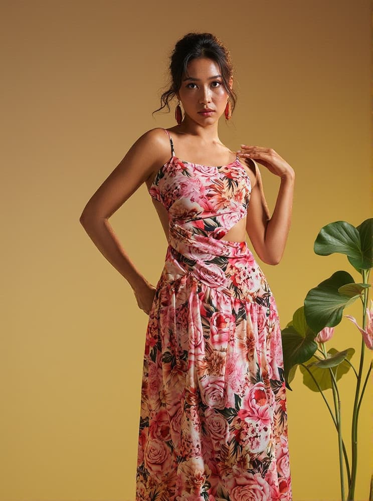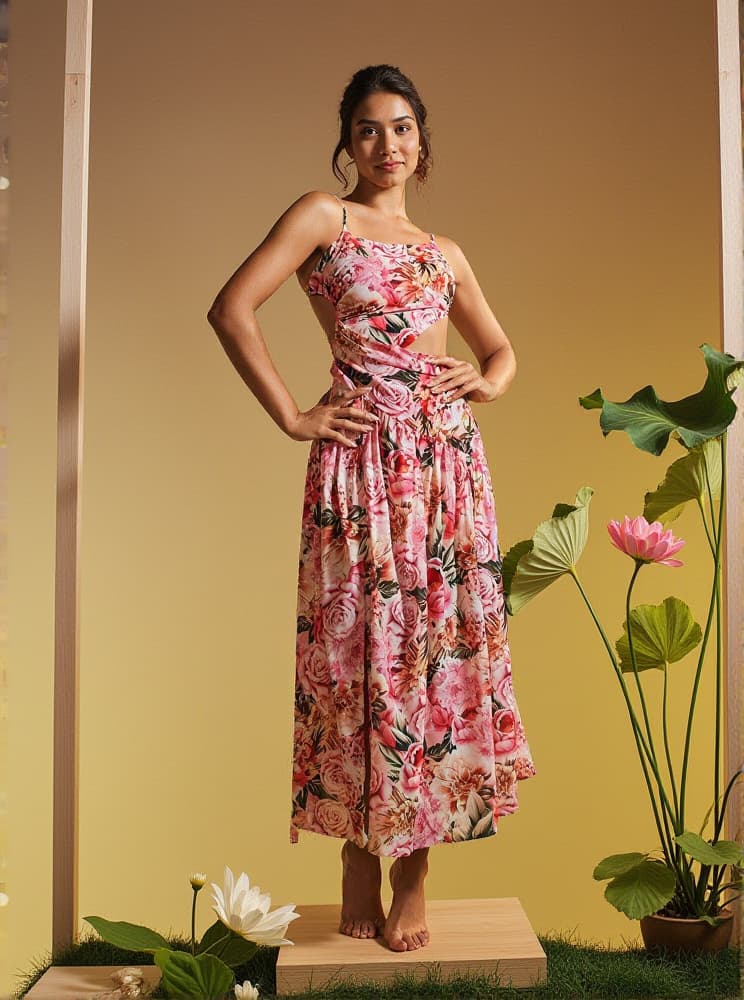 Unleash your inner fashionista with the Acie Spaghetti Floral Print Midi Dress. This gorgeous dress features a stunning floral print and delicate spaghetti straps, perfect for any occasion. Elevate your style and make a statement with this must-have piece!
