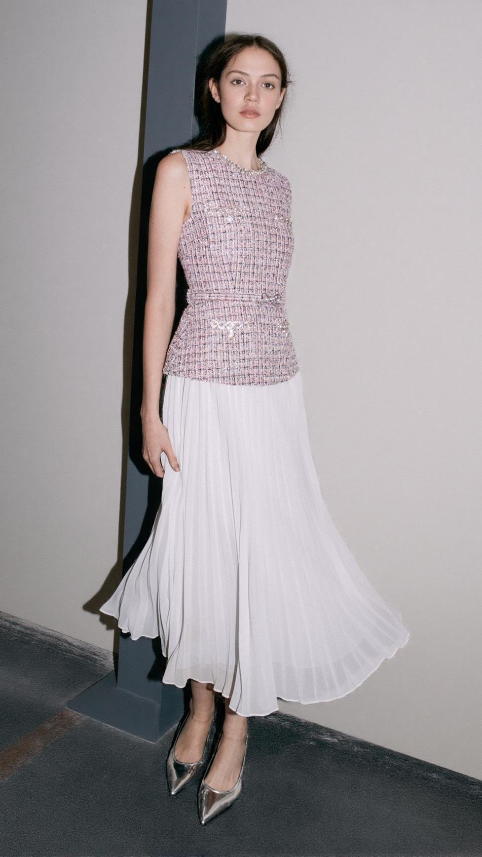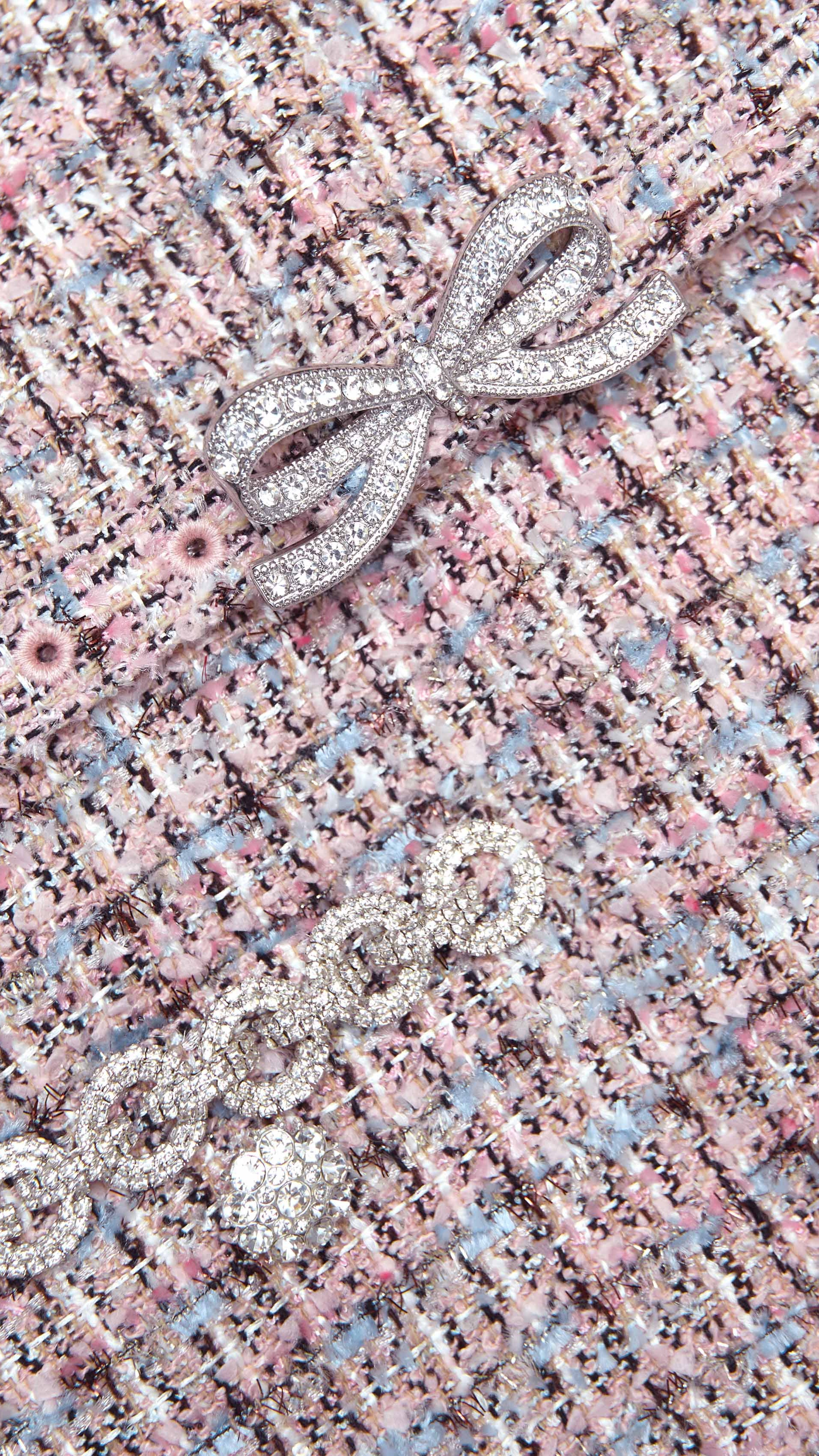 Structured pink bouclé and an airy chiffon skirt unite to elegant effect in this midi dress. Belted to flatter the waist, diamanté trims add decadent sparkle to the precisely tailored bodice.