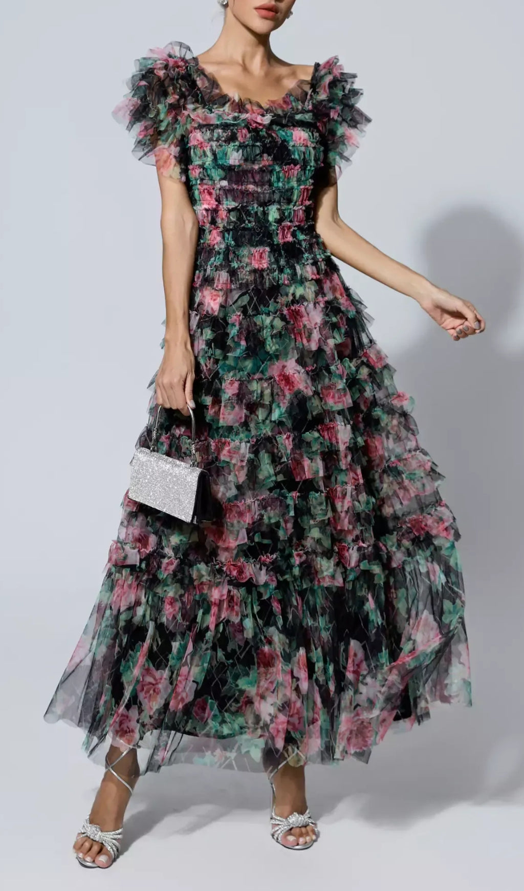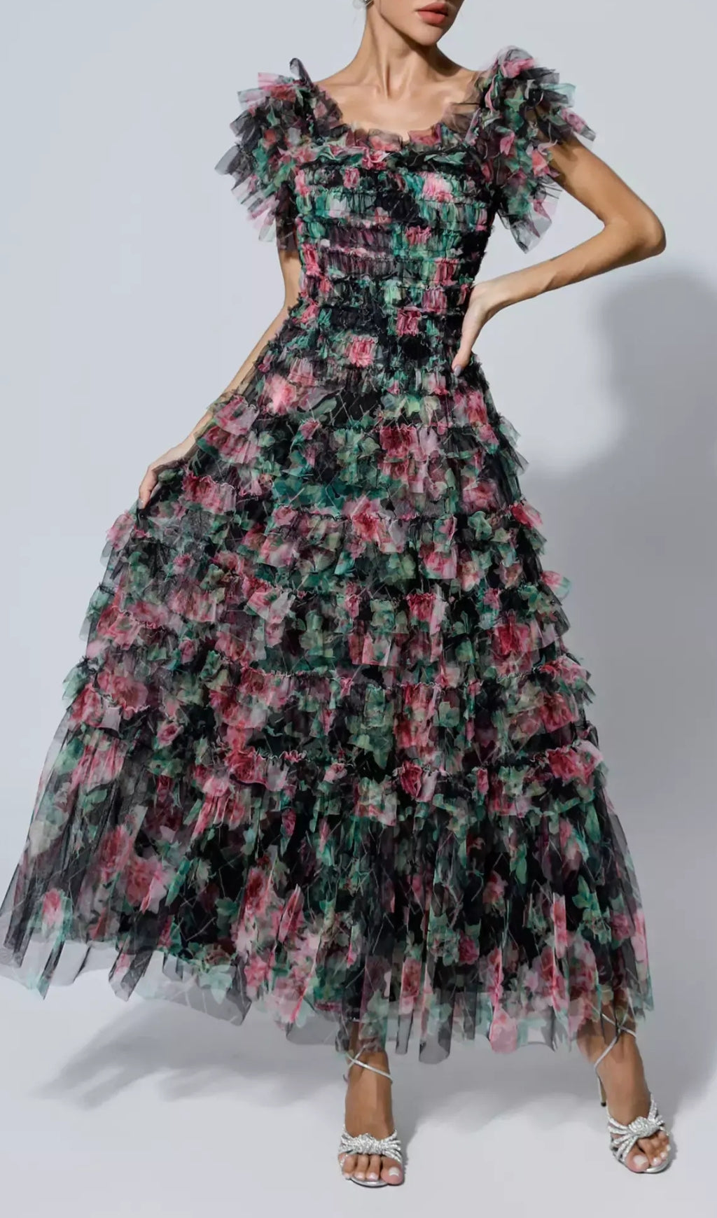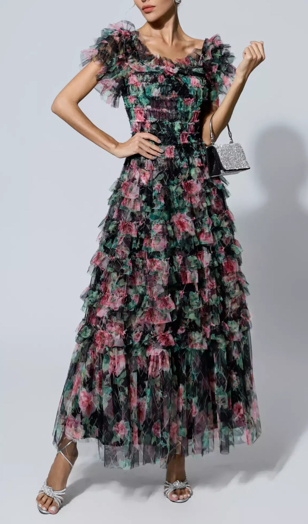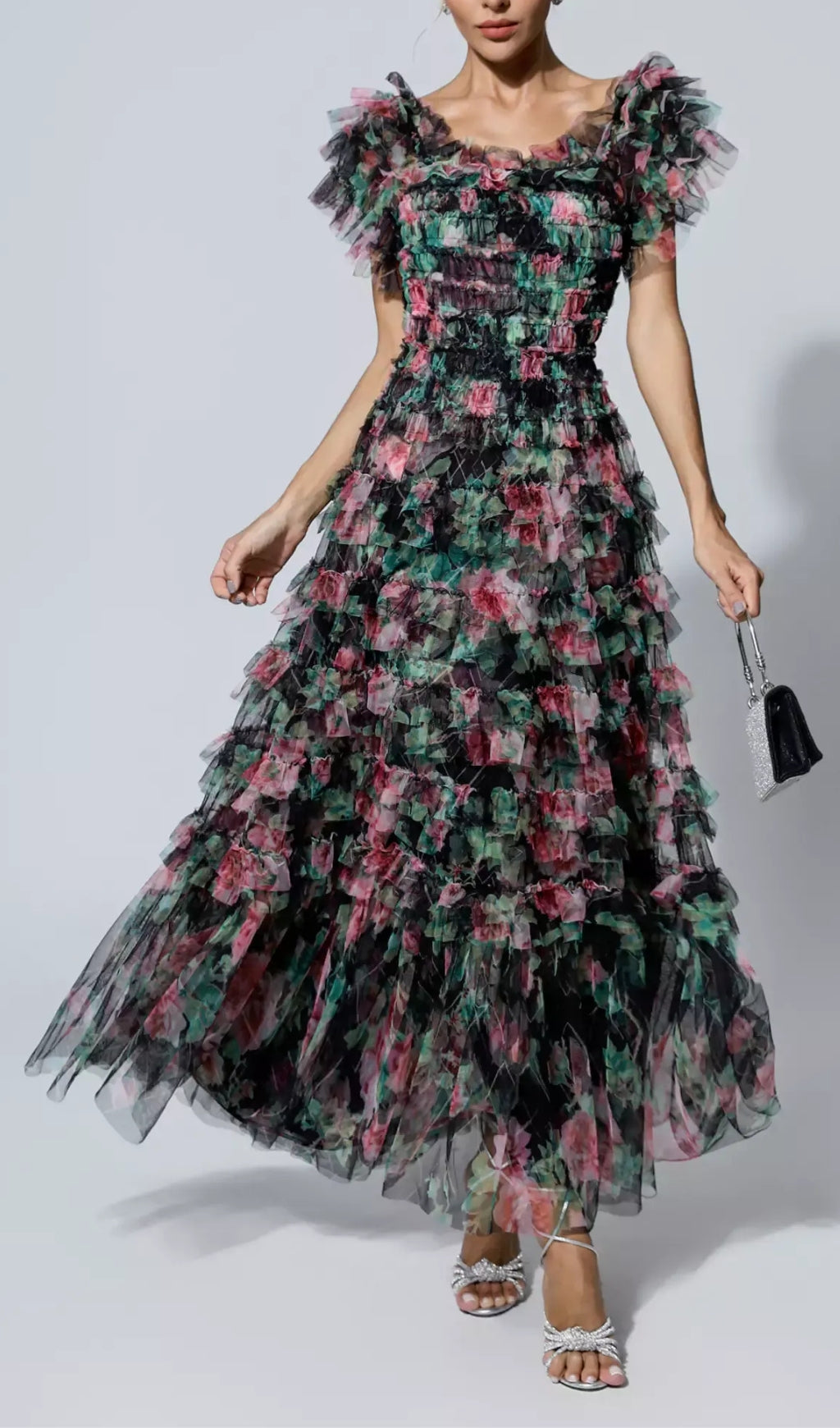 ADJOA BLACK RUCHED FLORAL MAXI DRESS