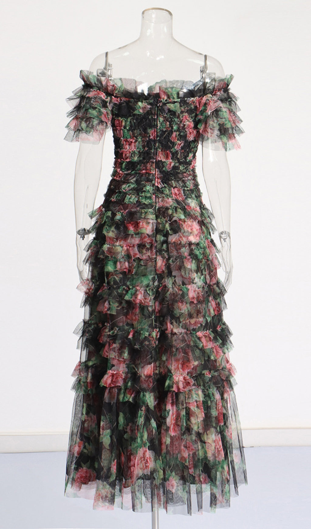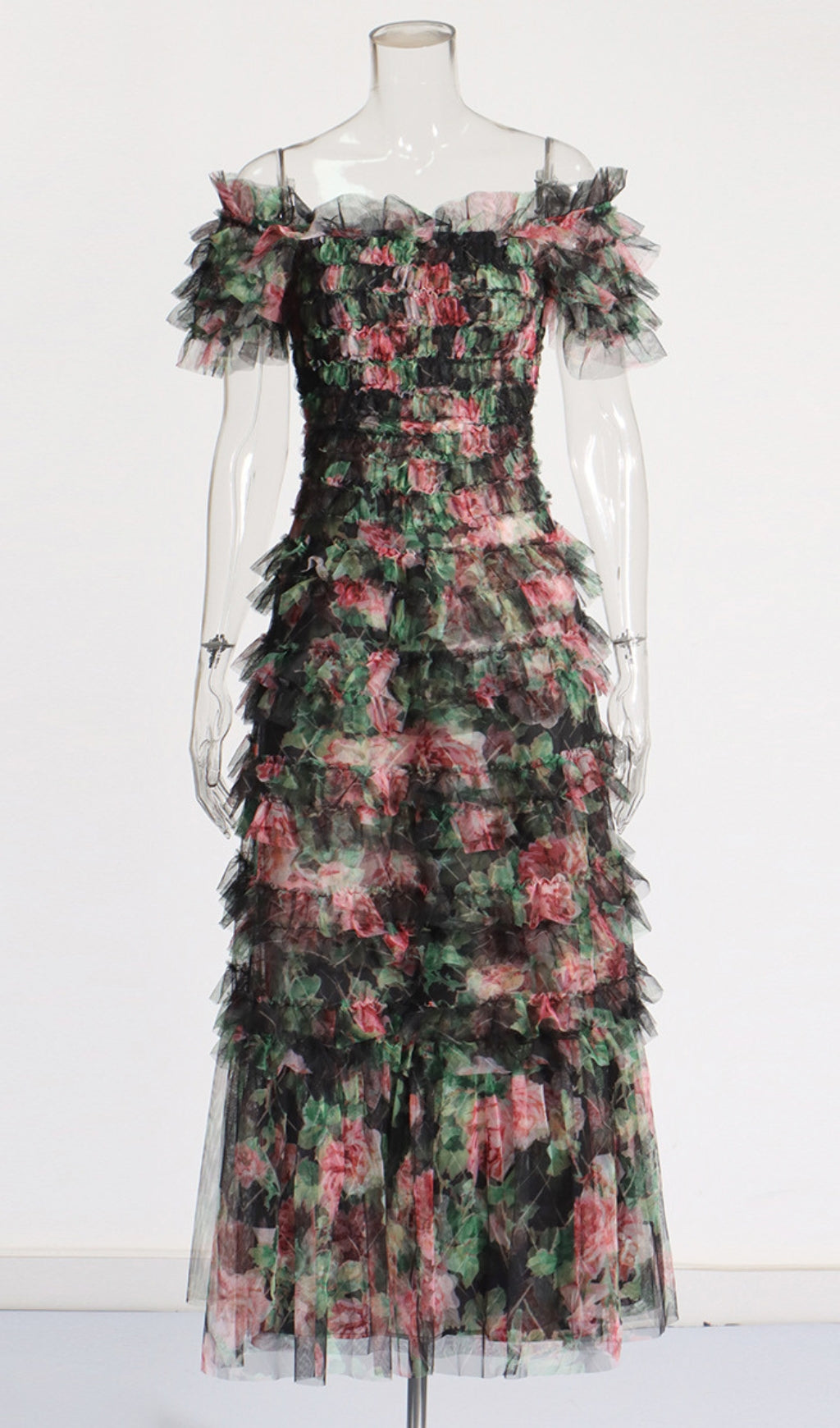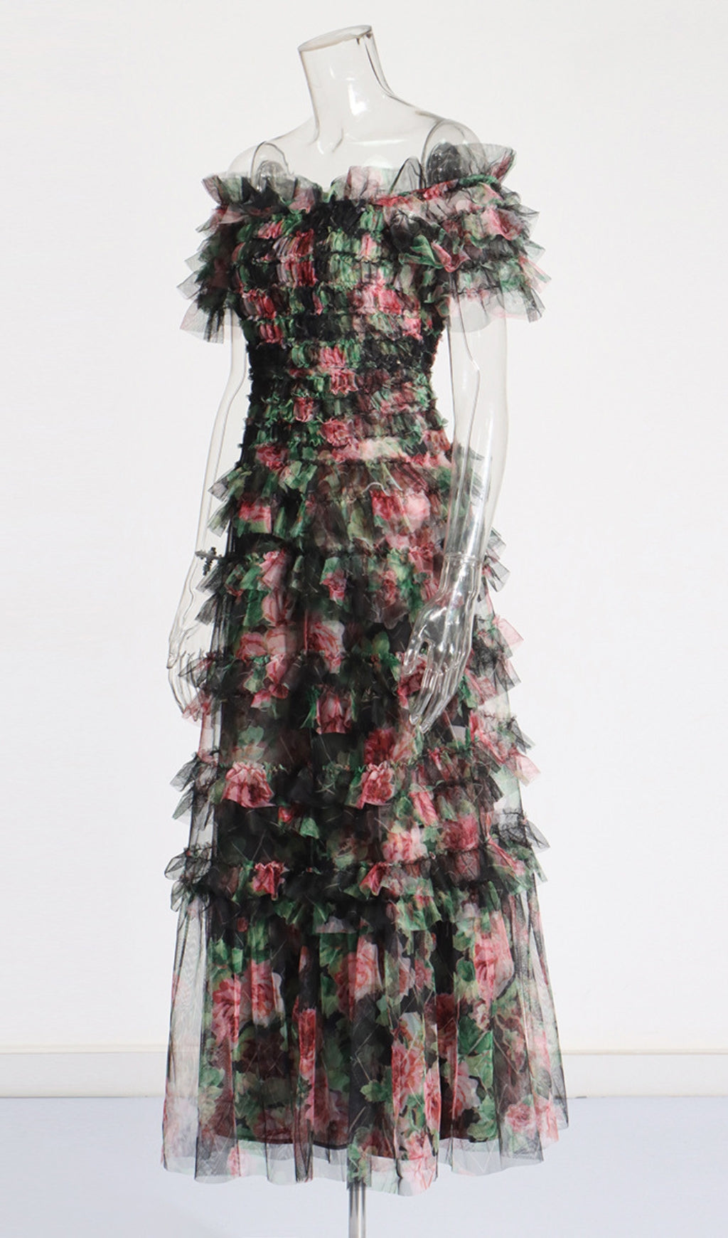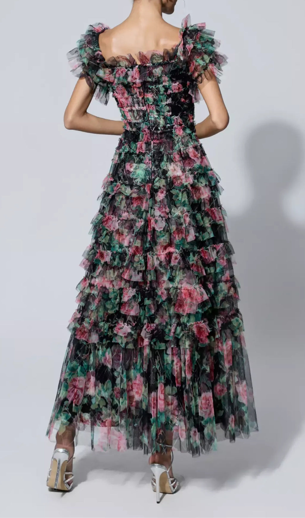 ADJOA BLACK RUCHED FLORAL MAXI DRESS