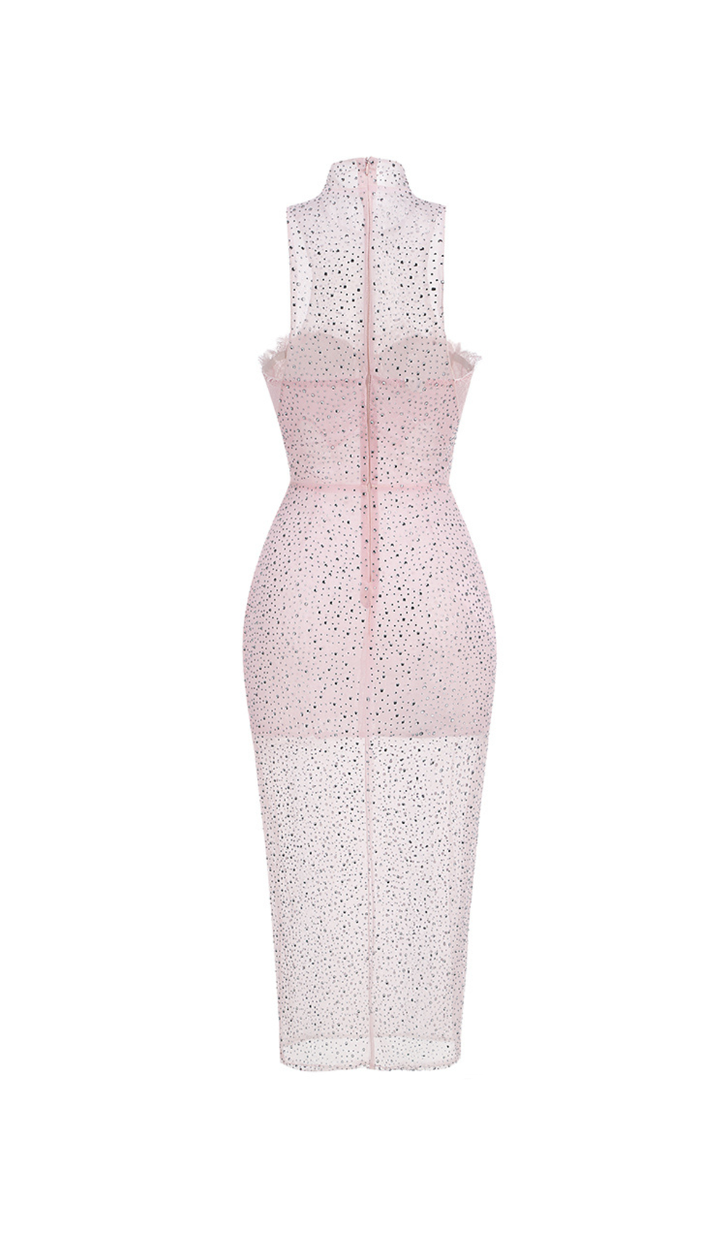 ADORA PINK BRAIDED LEATHER CRYSTAL EMBELLISHMENT MIDI DRESS