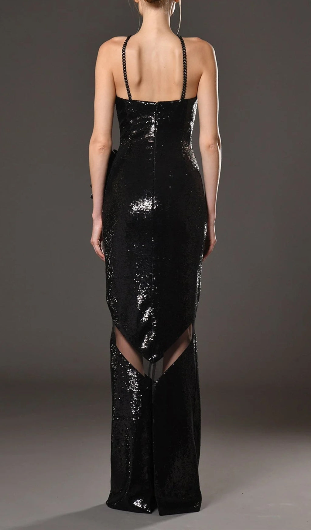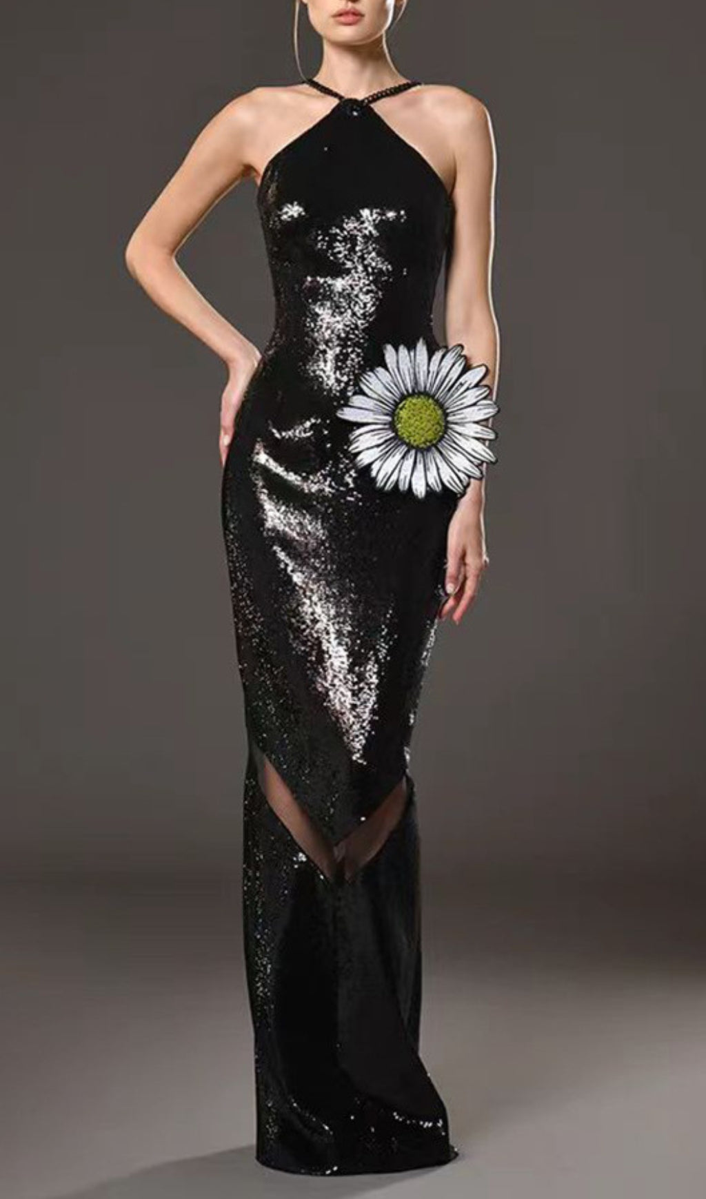 ADRASTEA SEQUINED DRESS WITH THREAD EMBROIDERED FLOWER