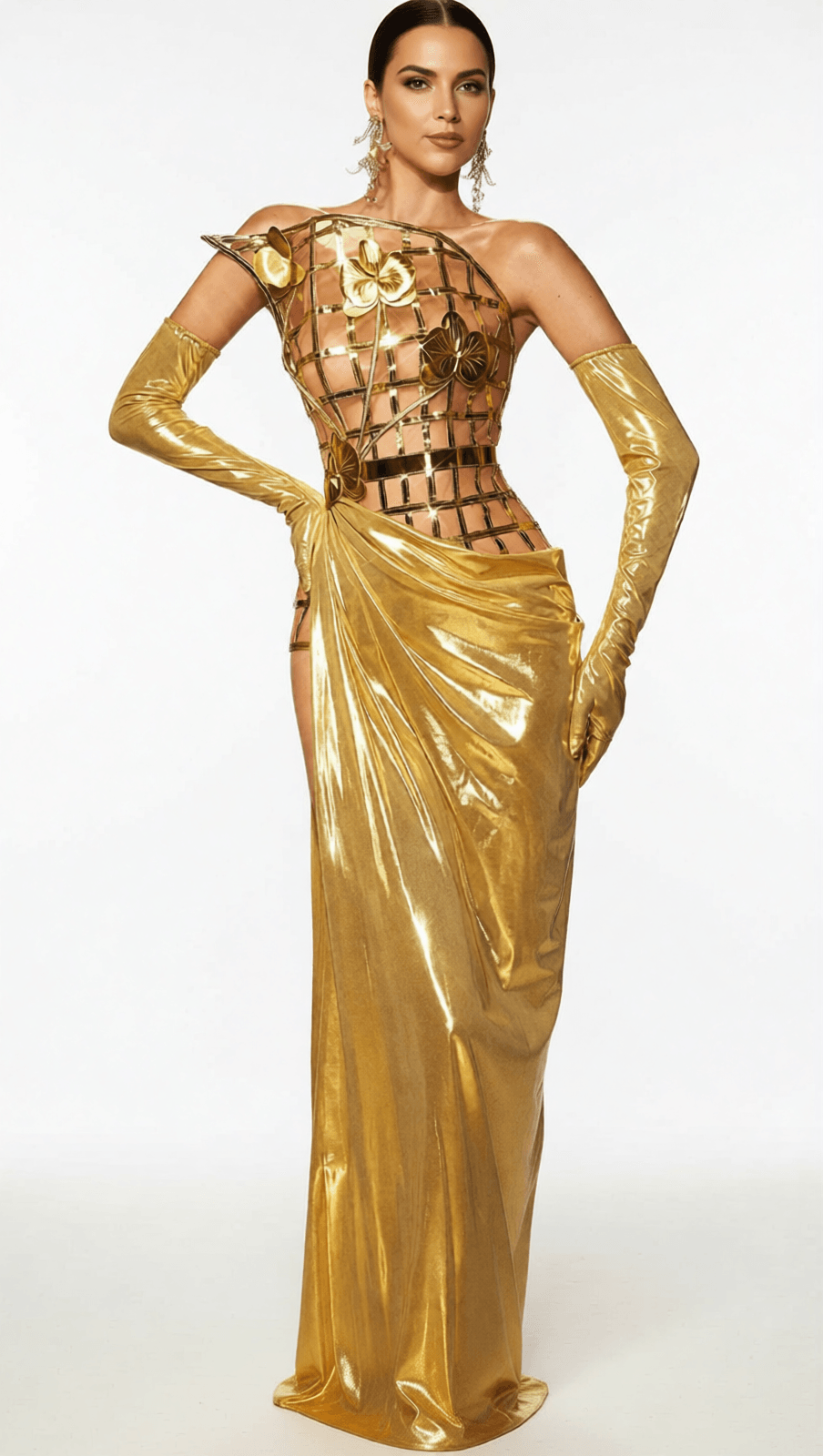 Crafted with a breathtaking **lustrous metallic gold fabric**, this dress drapes beautifully, creating a mesmerizing shimmering effect with every movement. The strapless design elegantly highlights your décolletage and shoulders, exuding sophisticated charm. What truly sets the Aethon apart are the **intricate 3D metallic floral and butterfly accents** that adorn the captivating grid-patterned bodice, adding a unique, artistic touch that sparkles under any light. The floor-sweeping maxi skirt features a daring **high-slit**, revealing a flash of leg and ensuring you make a dramatic entrance and exit.
