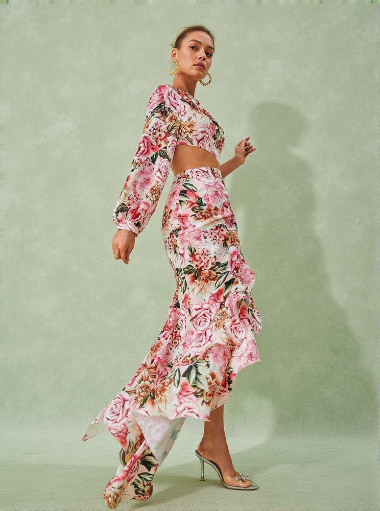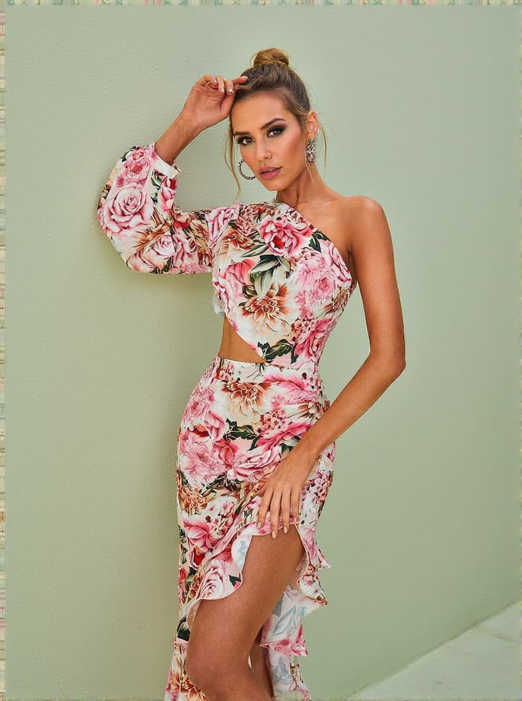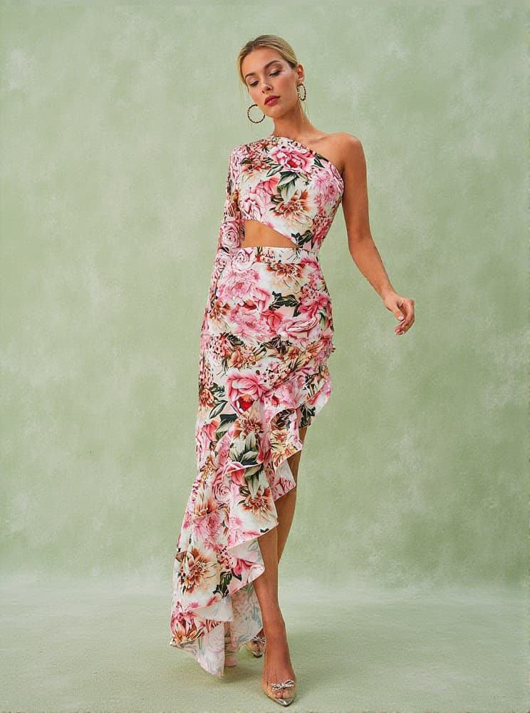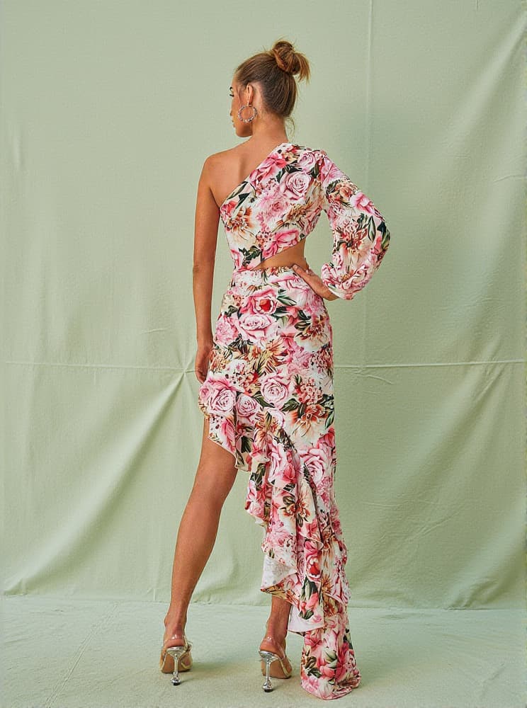Fill the gleamy days of your autumn trip with strokes of nature's painting brush with this Aiyana One Shoulder Floral Maxi Dress In Pink from Berrylush. Land in the world of outrageous fashion with this outfit that carries an iconic element one-shoulder neckline. What more stylish could be other than the asymmetric hem that flaunts your toned legs each time you walk. The pink colour with the playful floral print is apt for your fall season trips; especially for night hangouts and fill the party night on your trip with the essence of boldness & beauty. Accessorize this outfit with heeled pumps and a cartwheel hat to complete your charming look.