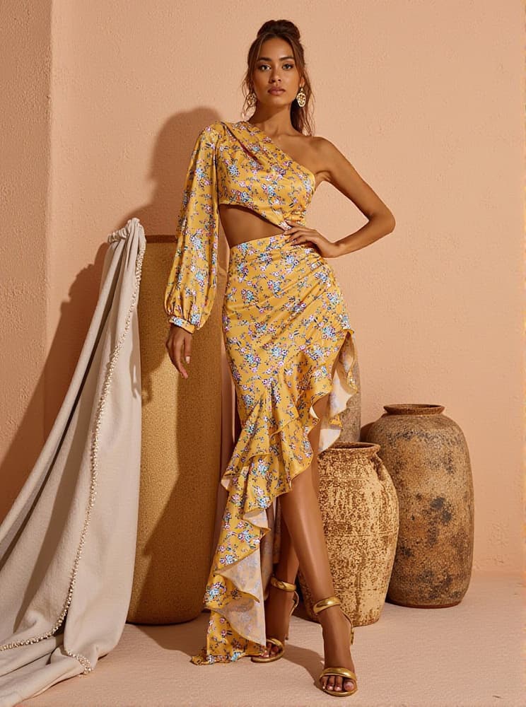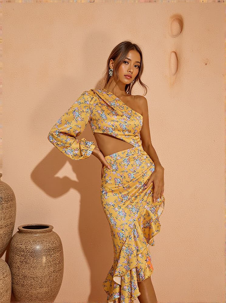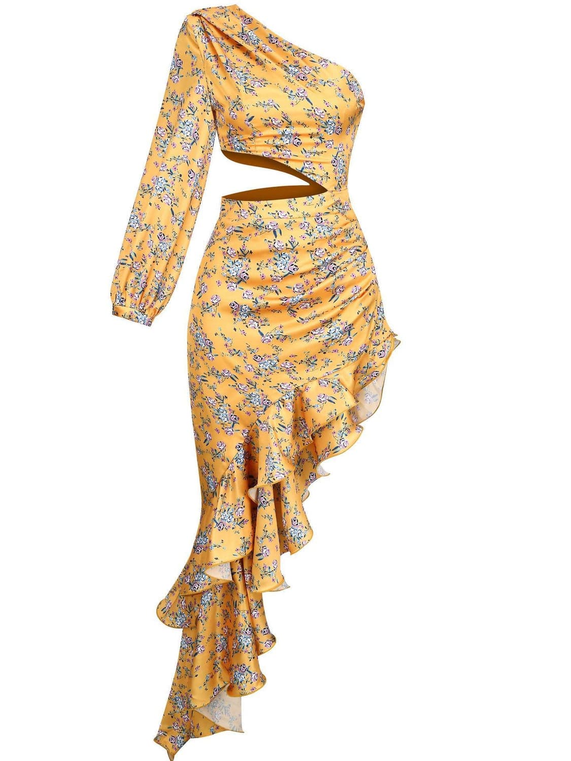 Fill the gleamy days of your autumn trip with strokes of nature's painting brush with this Aiyana One Shoulder Floral Maxi Dress In Yellow from Berrylush. Land in the world of outrageous fashion with this outfit that carries an iconic element one-shoulder neckline. What more stylish could be other than the asymmetric hem that flaunts your toned legs each time you walk. The yellow colour with the playful floral print is apt for your fall season trips; especially for night hangouts and fill the party night on your trip with the essence of boldness & beauty. Accessorize this outfit with heeled pumps and a cartwheel hat to complete your charming look.