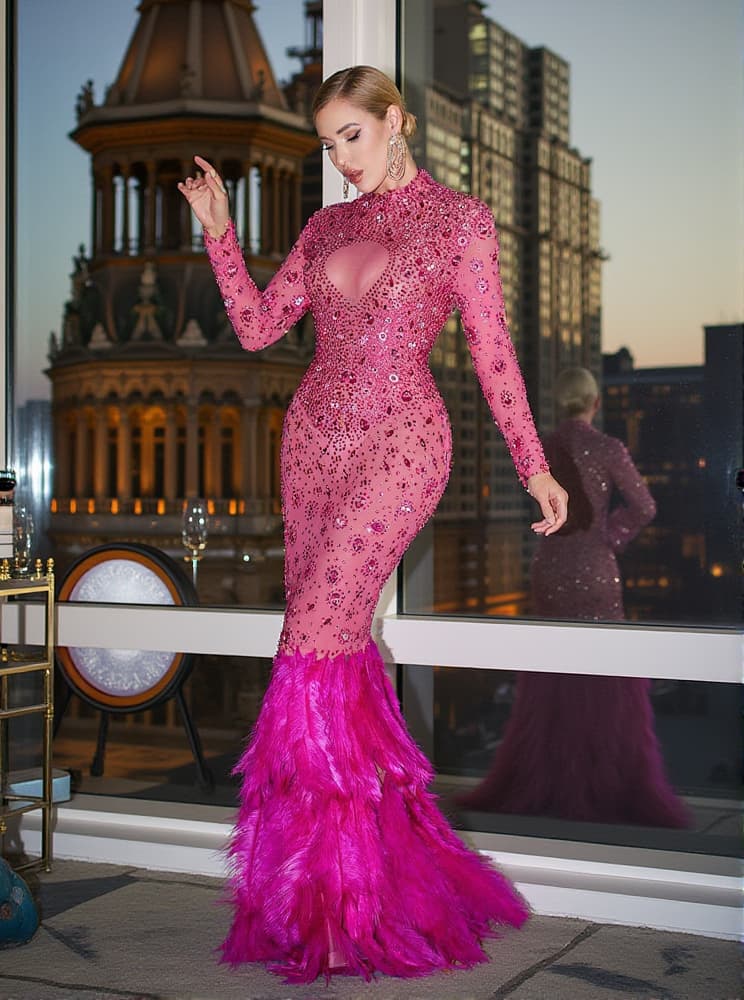 Akira Long Sleeve Rhinestone Feather Maxi Dress