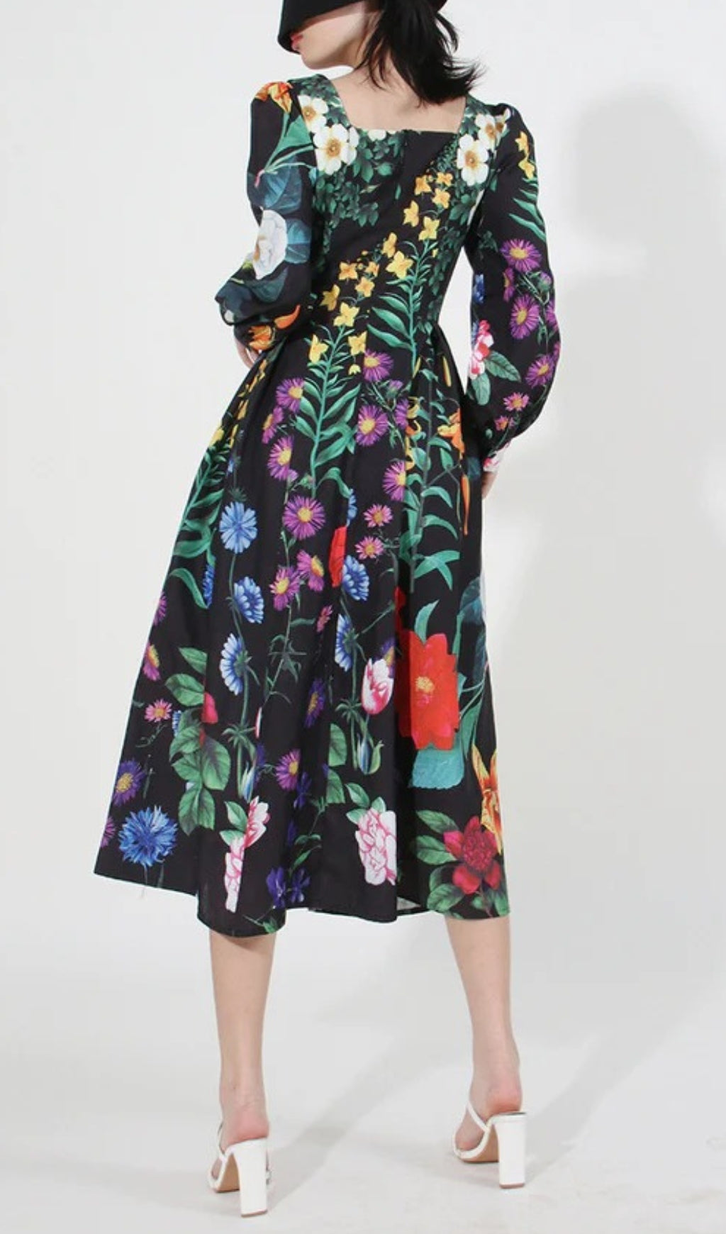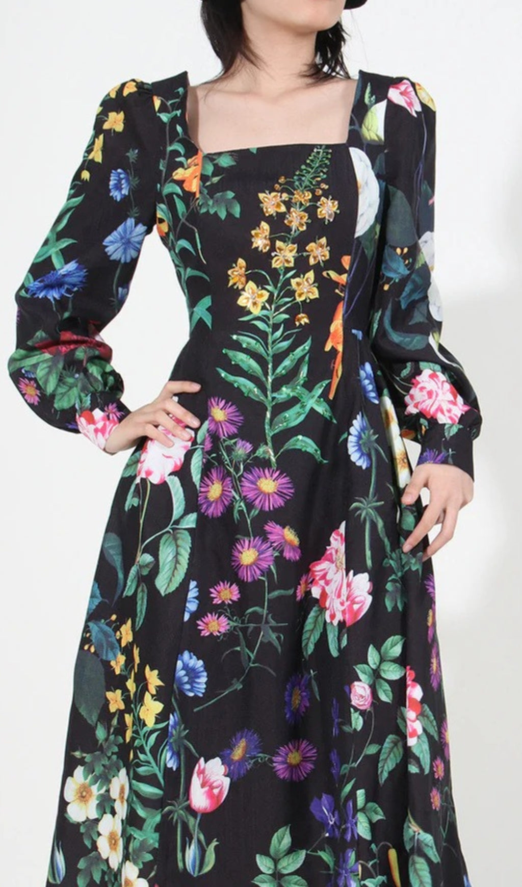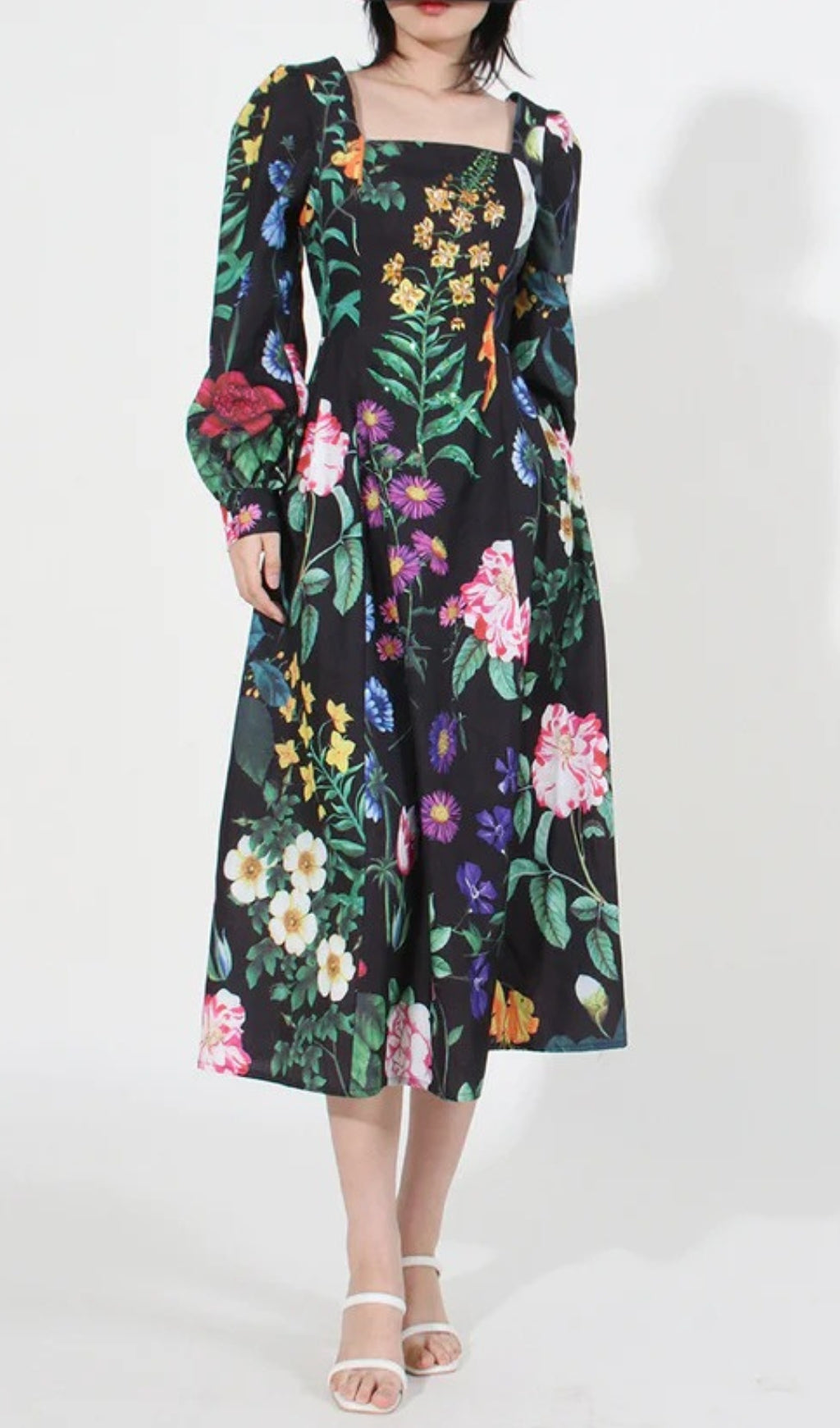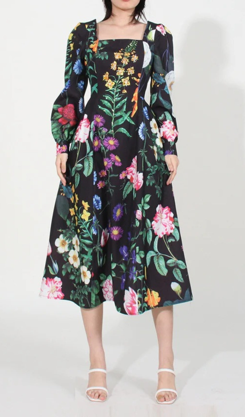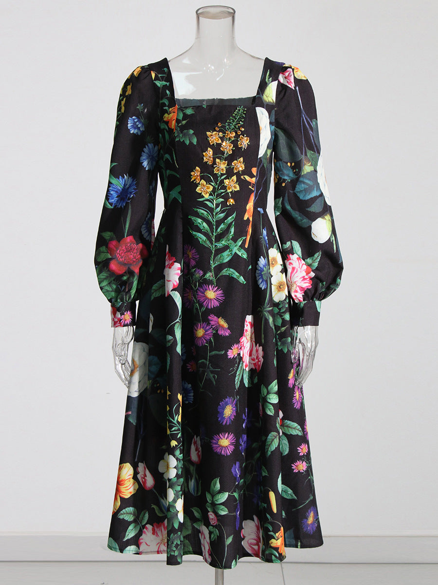 This stunning Printed Long Sleeve Cotton-Blend Midi Dress is perfect for refined occasions. It displays an exquisite botanical print pattern and its chic long sleeves, alongside a square collar, make for an exquisite combination of classic and modern style. Crafted with quality fabric, this dress is a timeless showstopper that exudes sophistication and luxury.