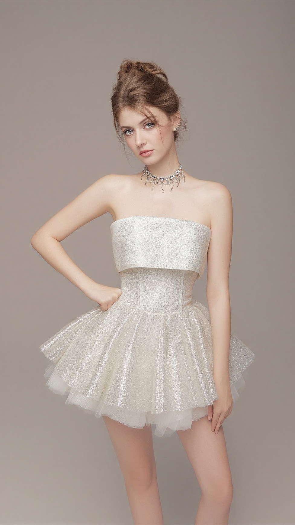 This Alberta mini dress features delicate mesh tulle crafted into a strapless tutu silhouette, designed in a soft apricot shade. Its lightweight layers create a graceful volume while ensuring comfort and freedom of movement. Ideal for special occasions, this piece combines expert tailoring with contemporary charm to deliver an elegant yet playful look.