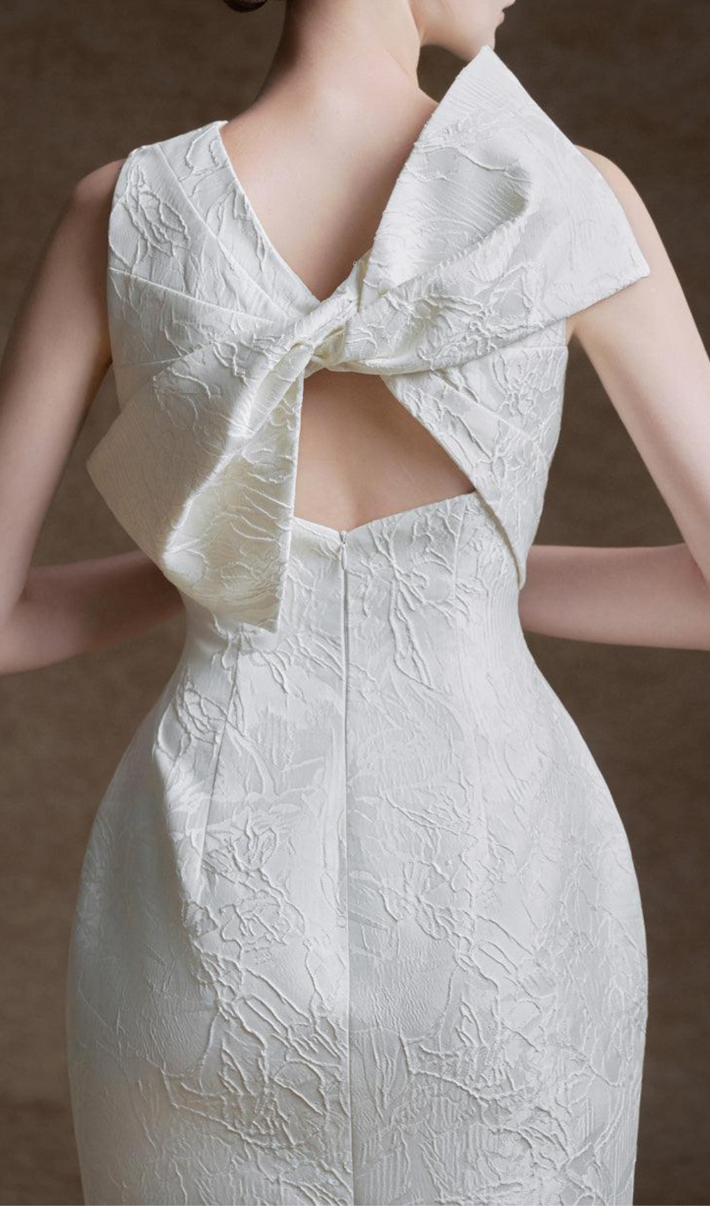 In a stunning white hue, this dress features a pegged back slit design, adding a touch of sophistication. Made with a delicate brocade fabric, it's perfect for any special occasion. Elevate your style with this exclusive piece.