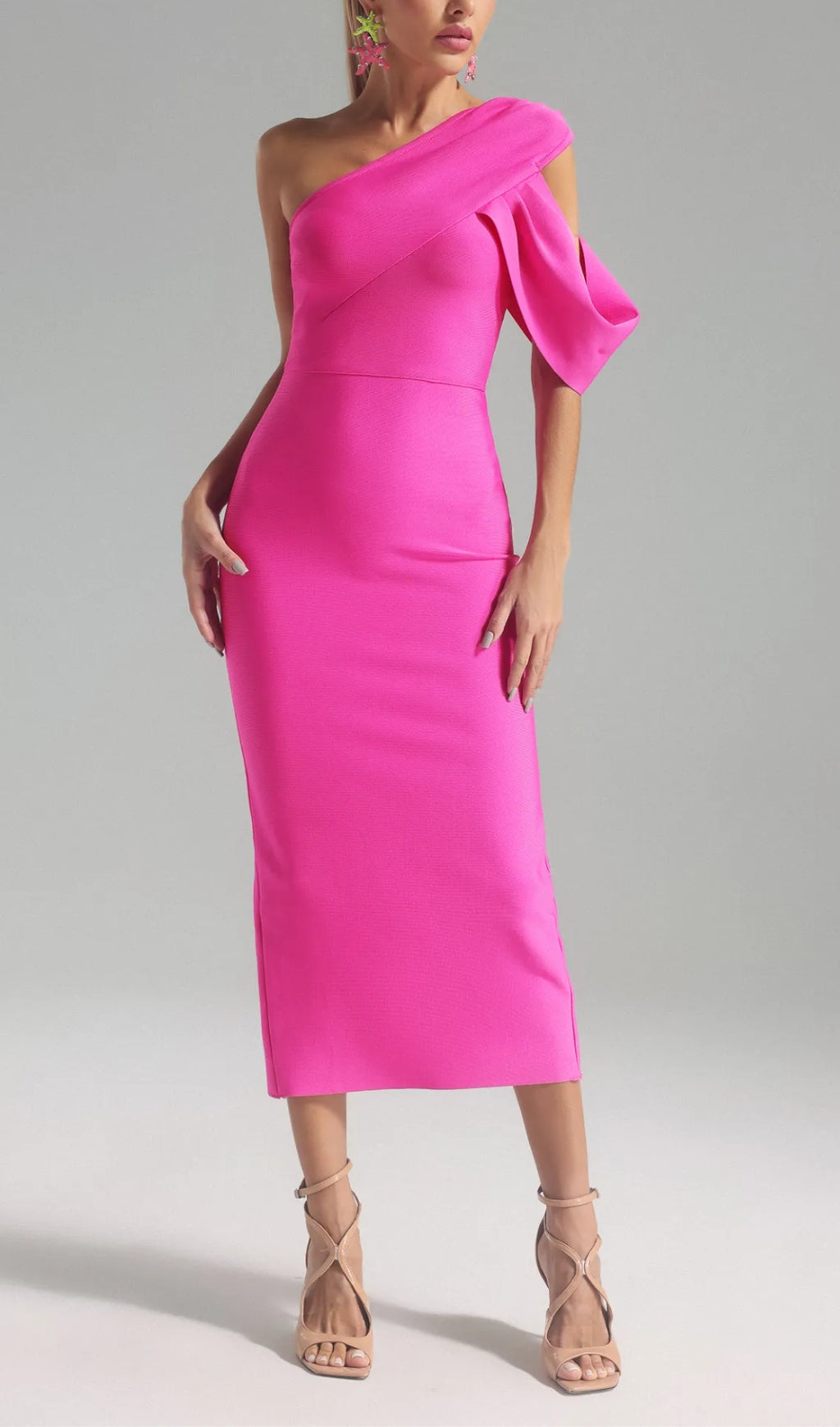 The ALEXIS ONE SHOULDER BANDAGE DRESS is the perfect blend of style and comfort. The one shoulder design adds a touch of elegance, while the bandage fabric hugs your curves for a flattering fit. Dress it up for a special occasion or wear it casually for a night out. Elevate your wardrobe with this must-have dress.