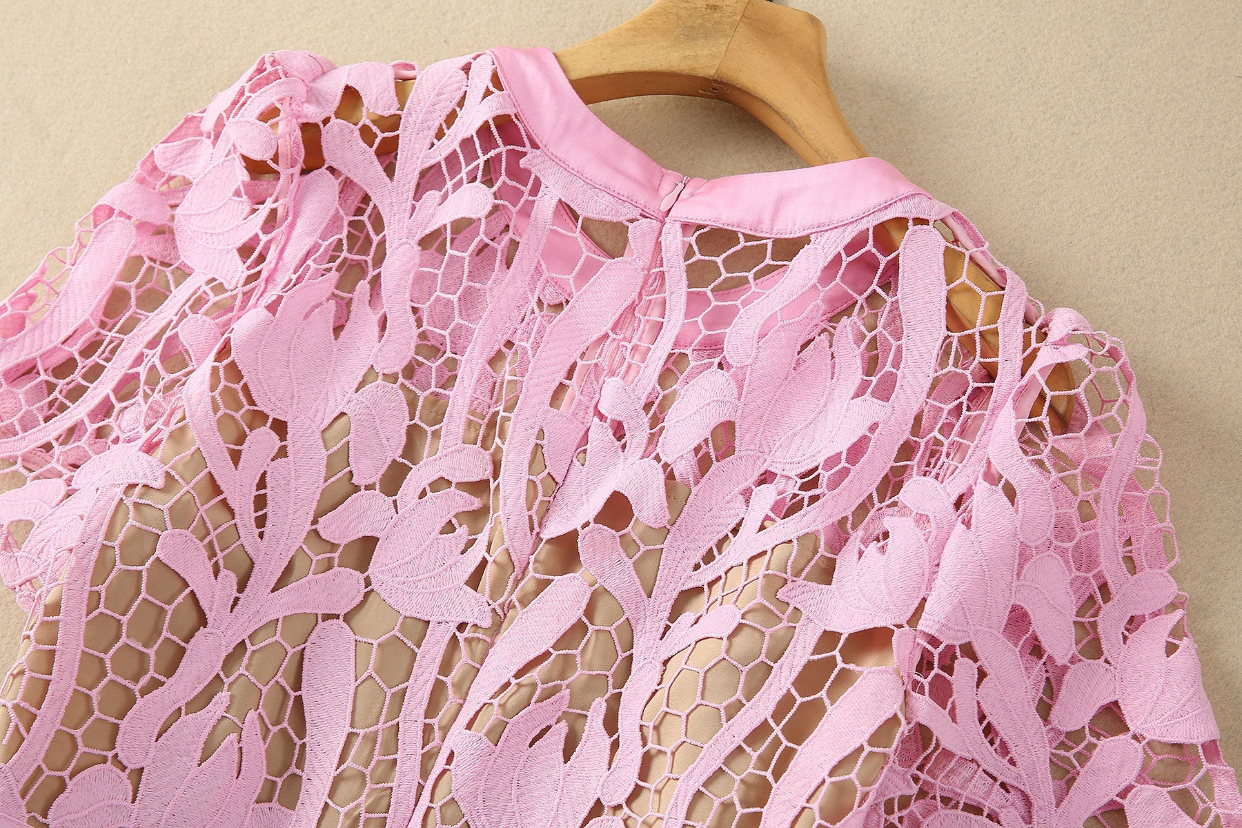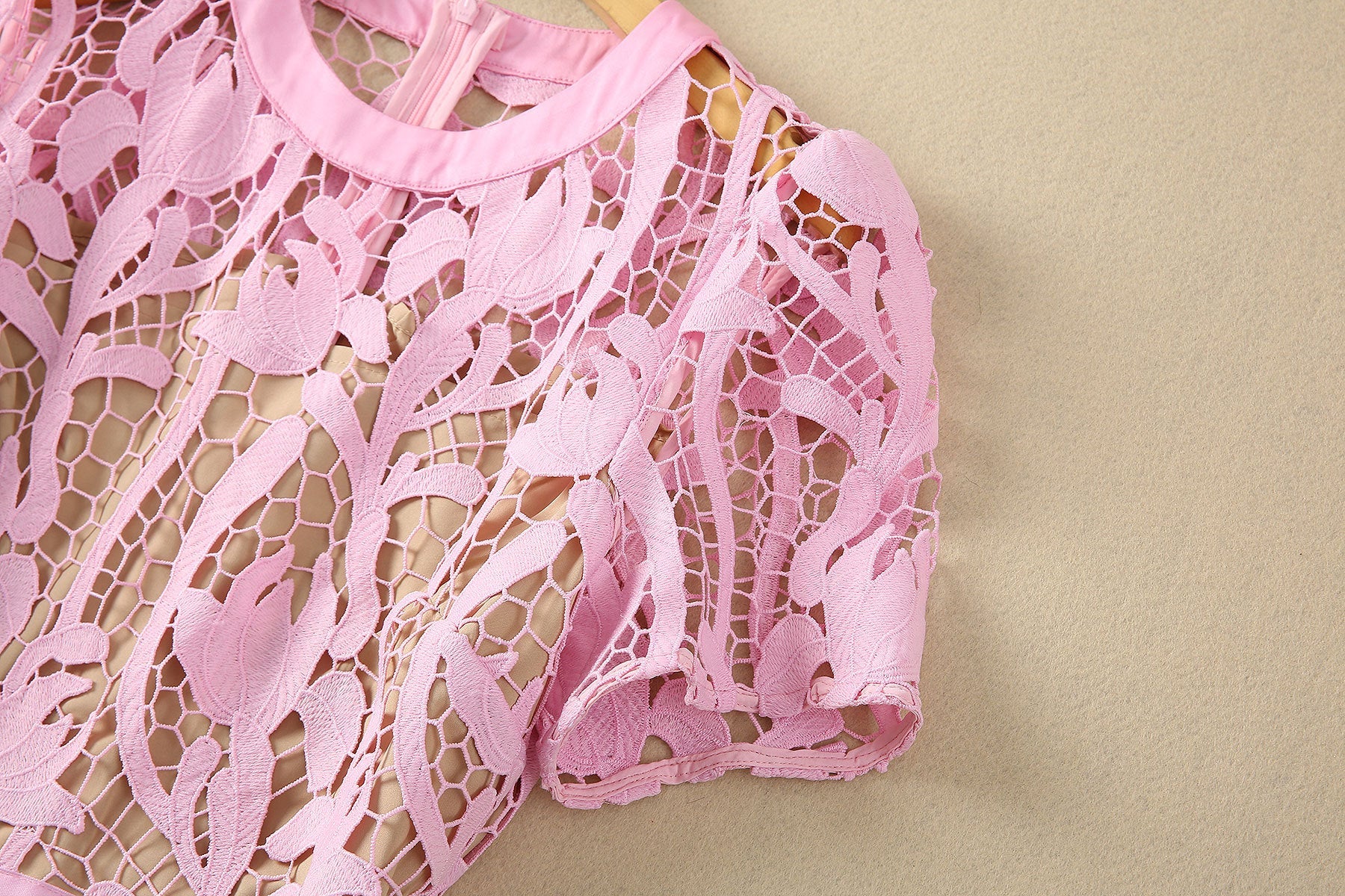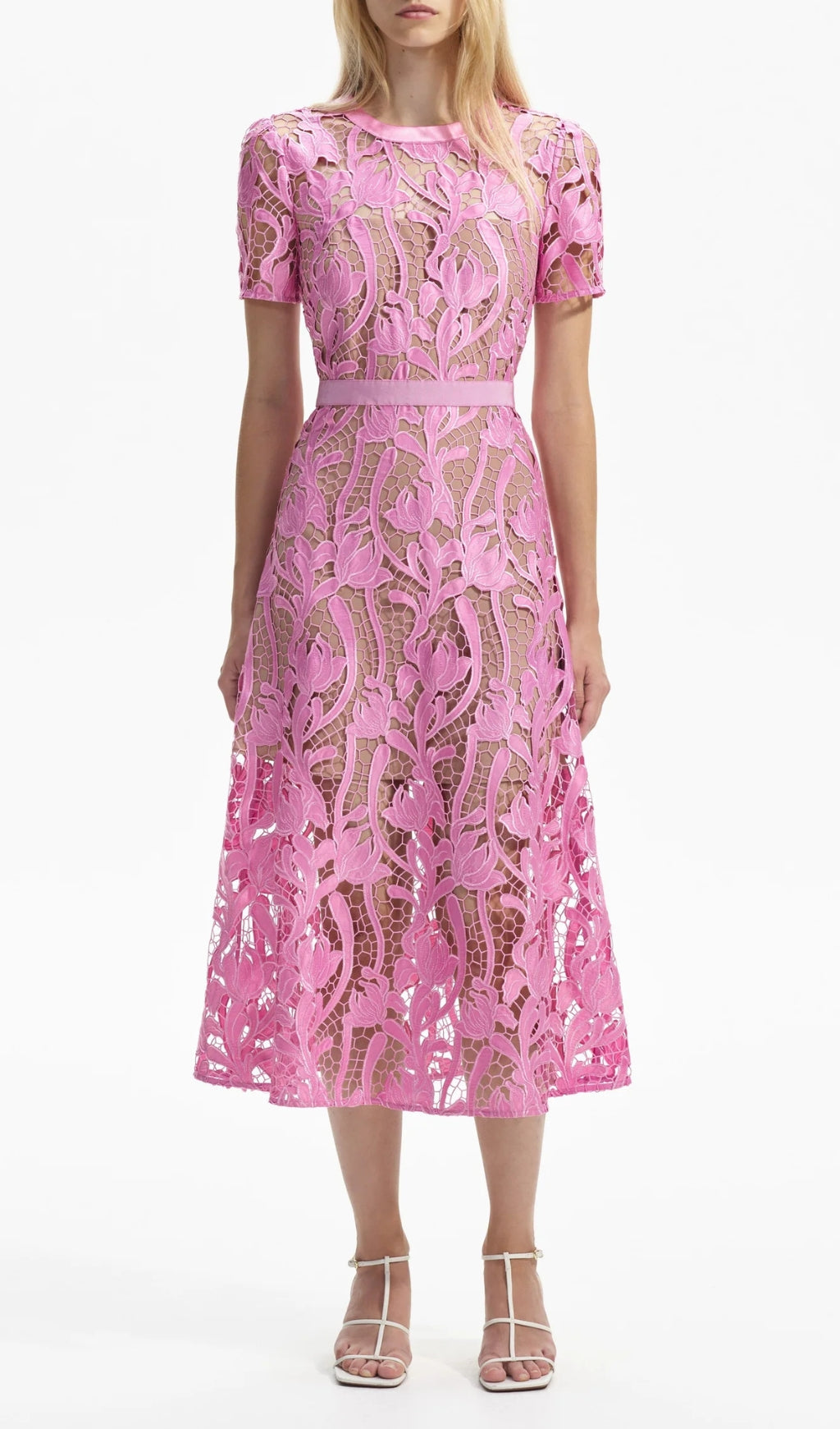 A figure-flattering vision in blue cut-out lace, this dress fuses a ladylike sensibility with photo-ready accents. Its chic crew neckline is lined with trim to echo its waist-cinching tonal belt, while a fitted bodice and full twirl-worthy skirt make for a universally beloved silhouette. Pair it with red lipstick and stilettos for a dose of old Hollywood glamour.