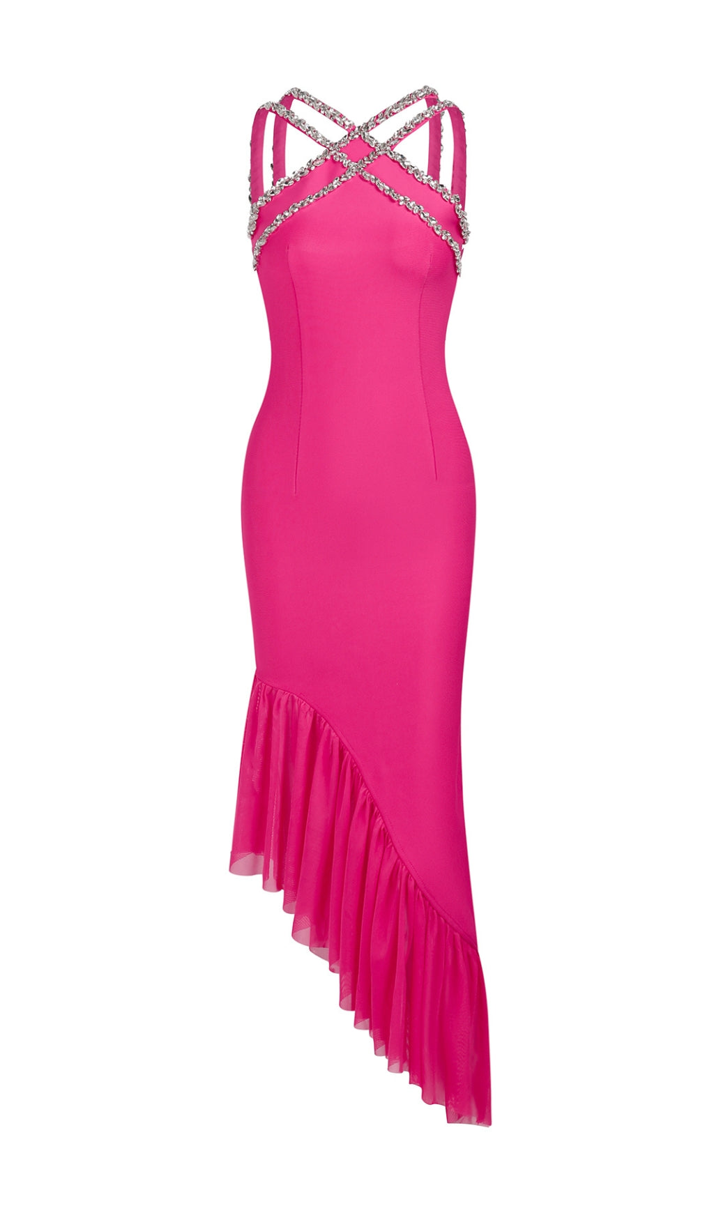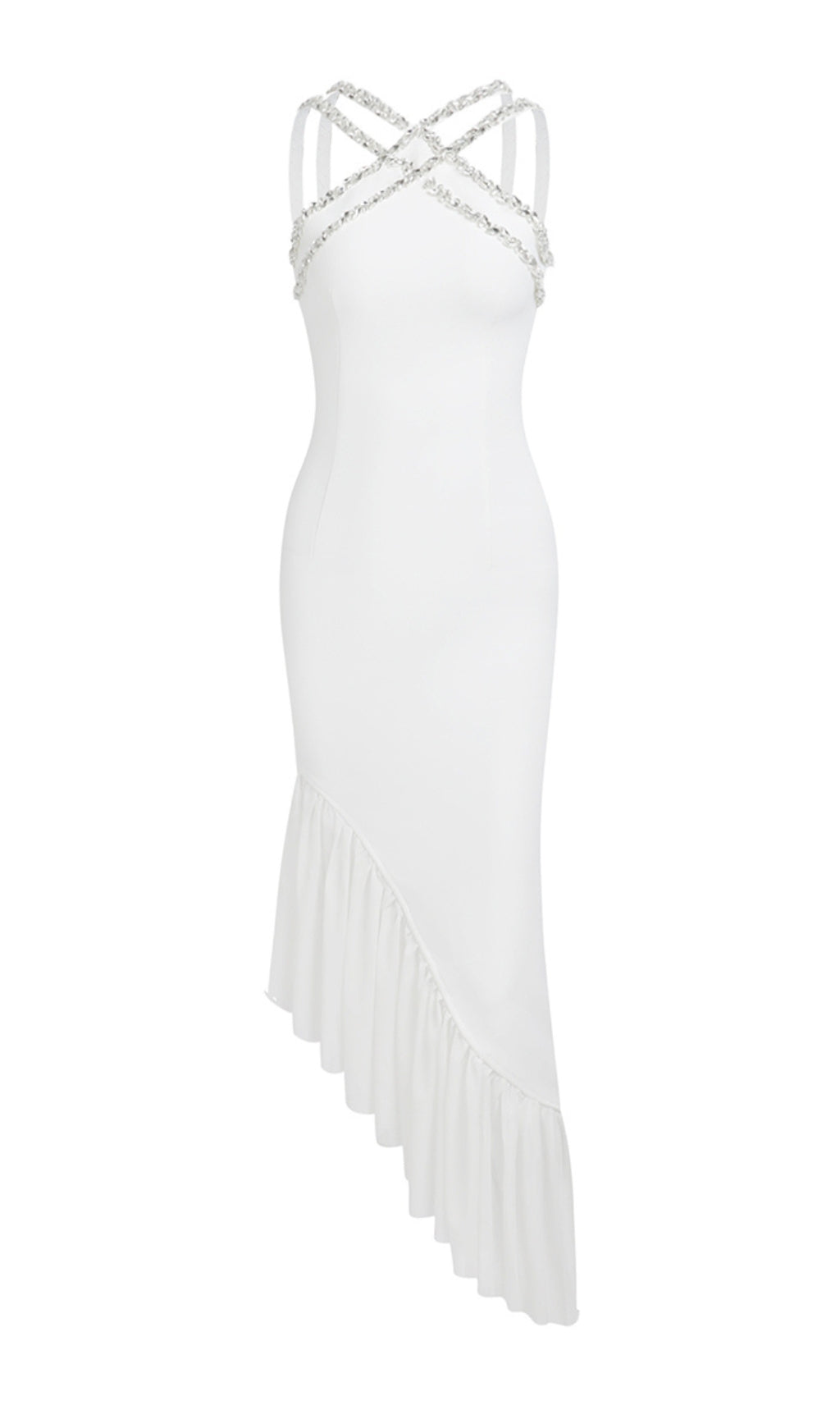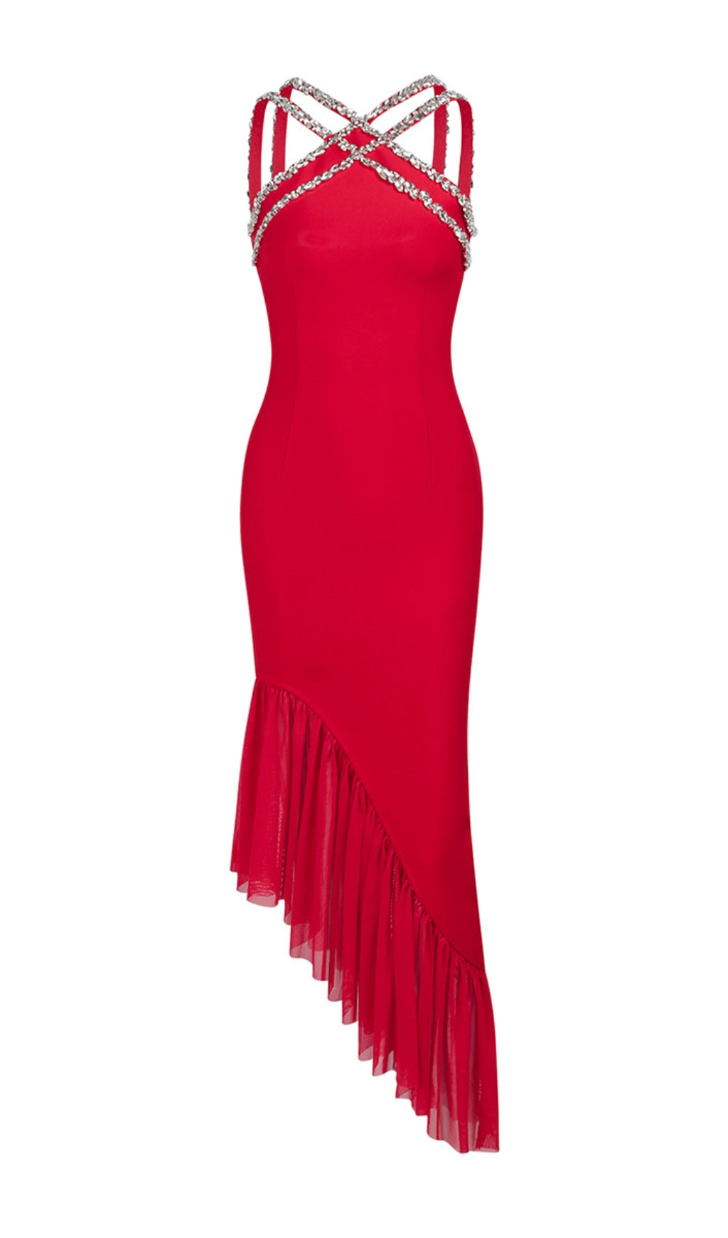 Shine and sparkle in the ALLETE HALTER CRYSTAL RUFFLE MAXI DRESS. This stunning dress features a halter neckline and cascading crystal ruffles, perfect for any special occasion. Feel like a true fashion queen as you dance the night away in this show-stopping piece.