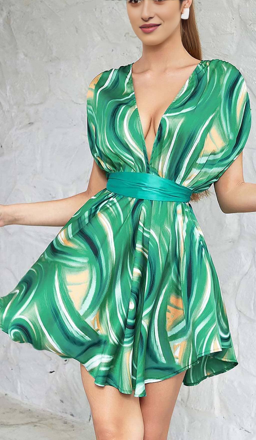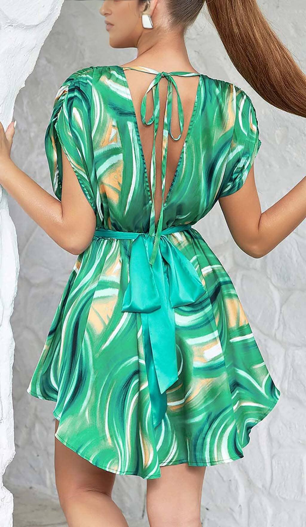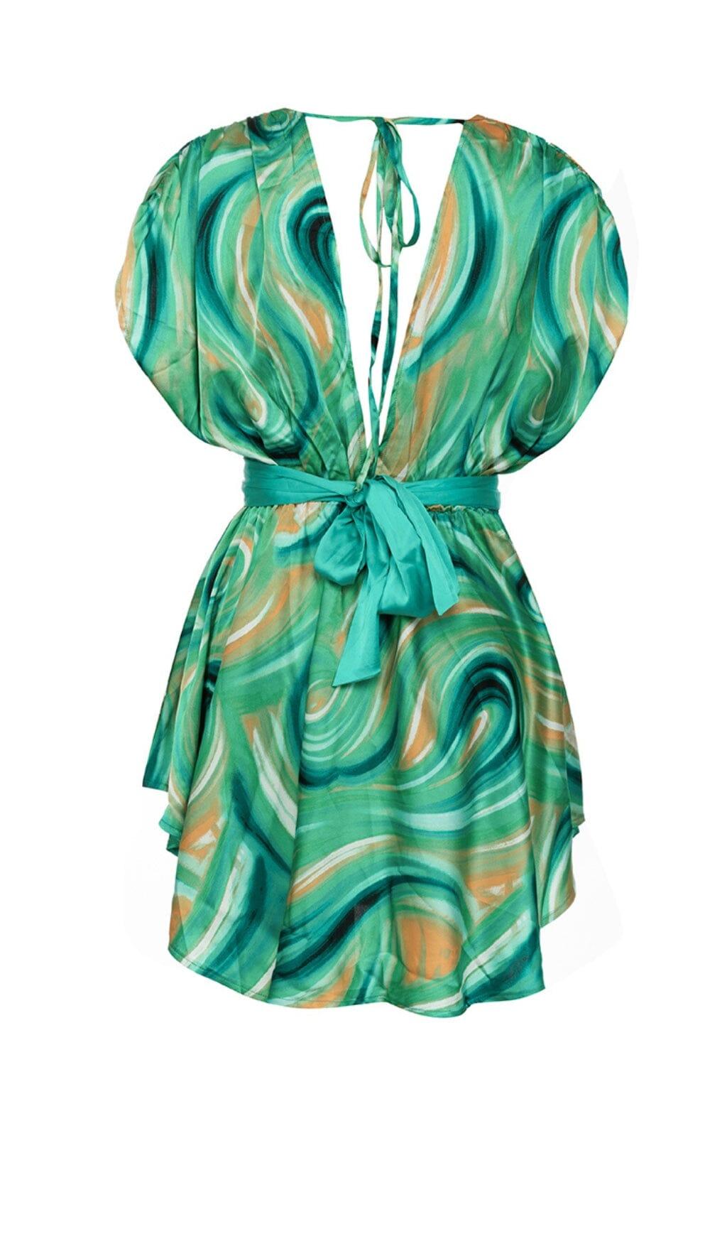 ALLOVER PRINT PLUNGE MINI DRESS IN LIME GREEN