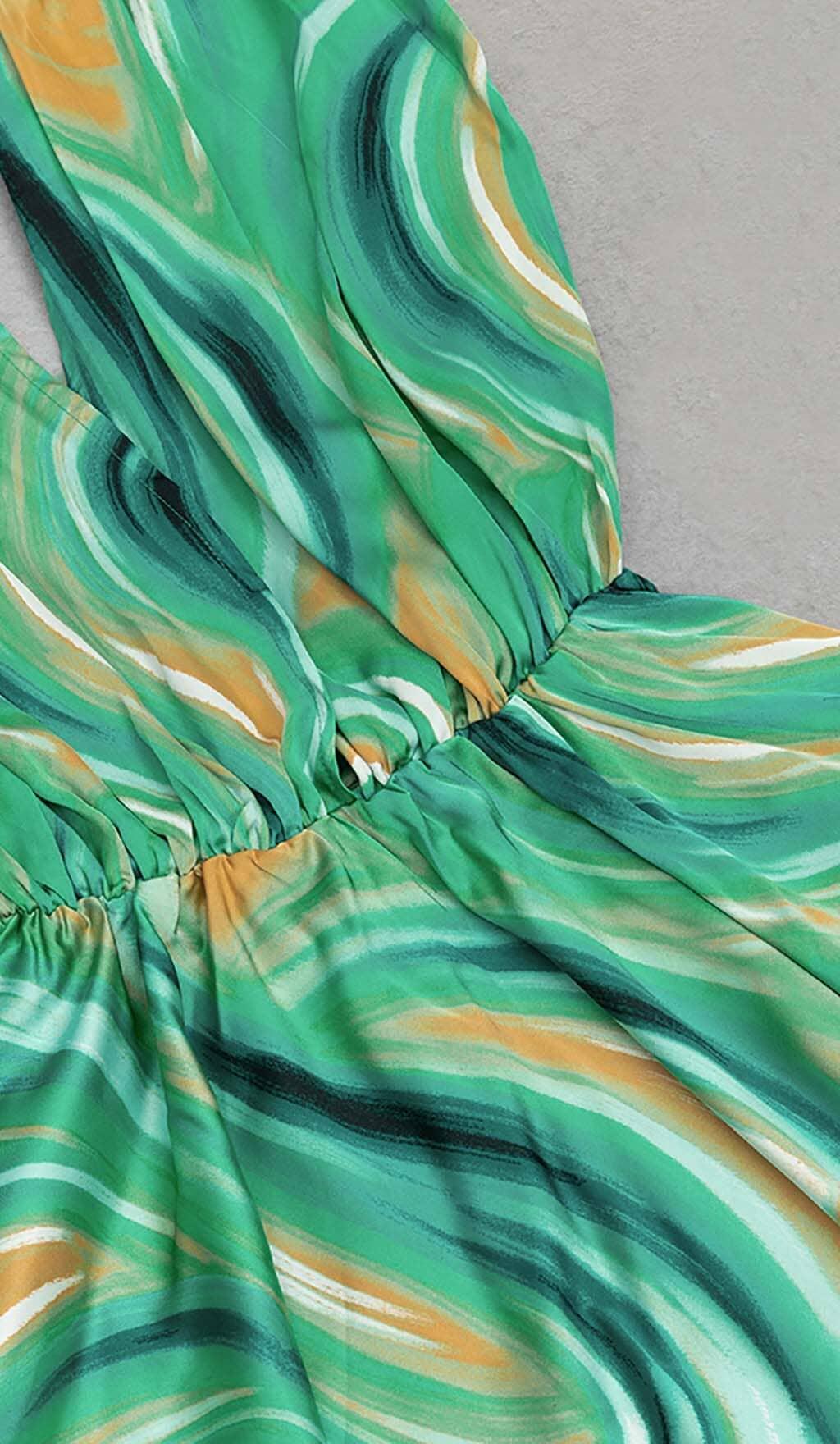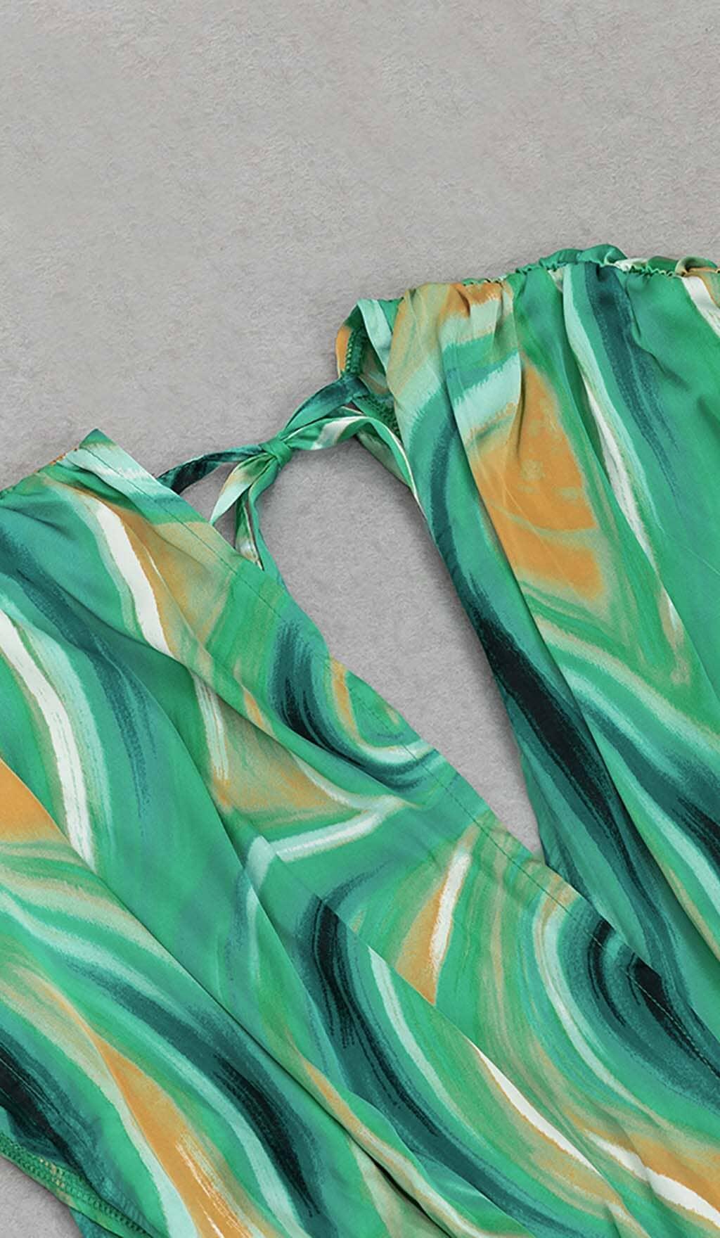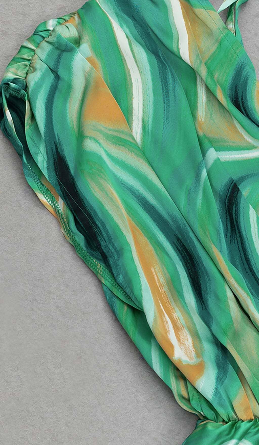 ALLOVER PRINT PLUNGE MINI DRESS IN LIME GREEN