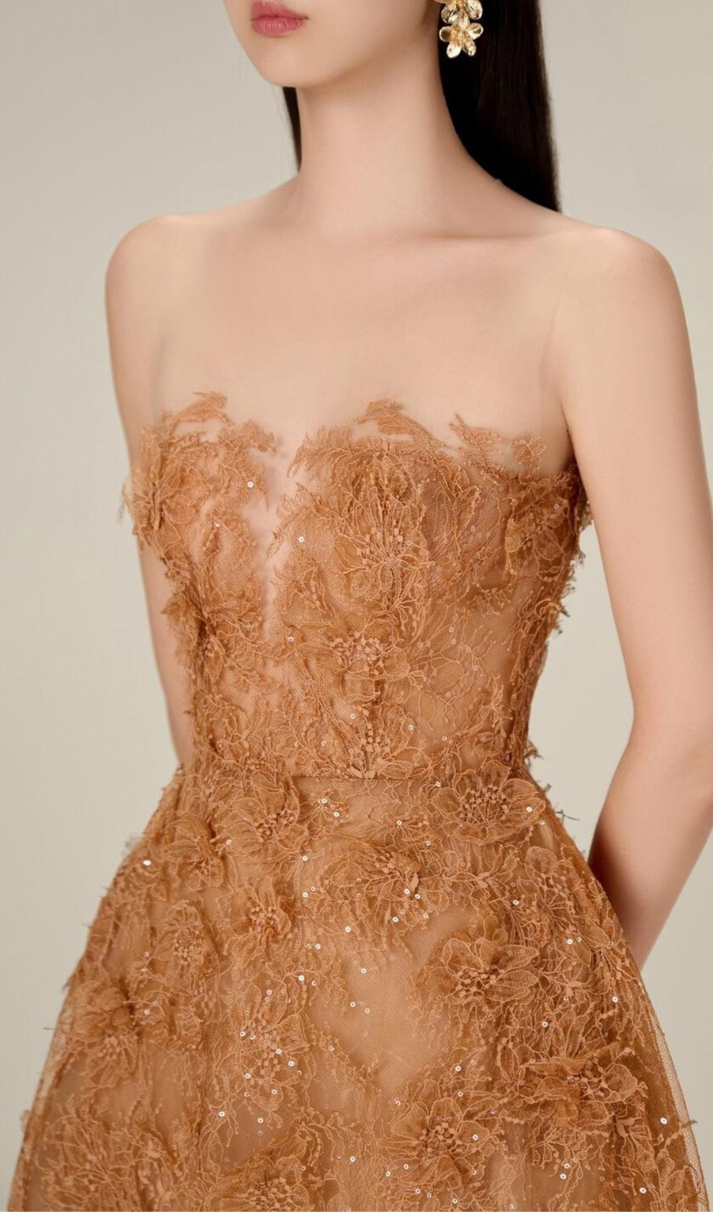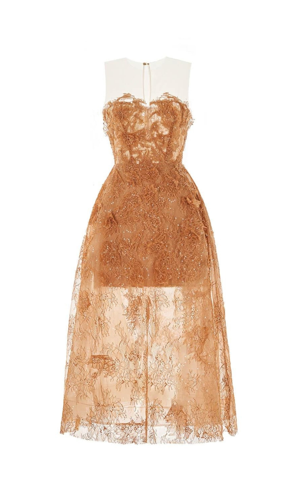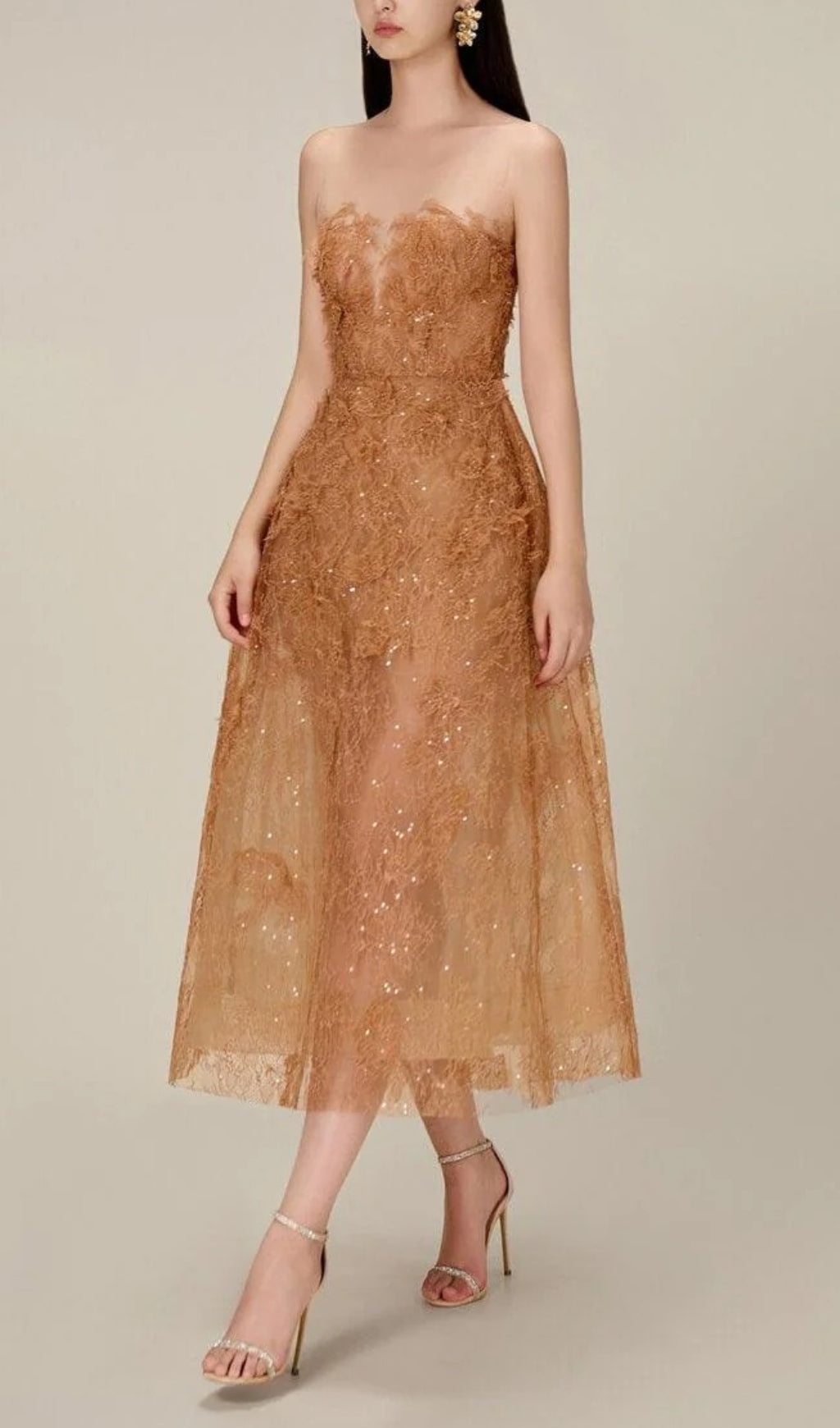 ALLYSON CARAMEL FLORAL LACE EMBROIDER MIDI DRESS