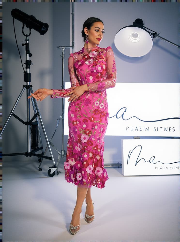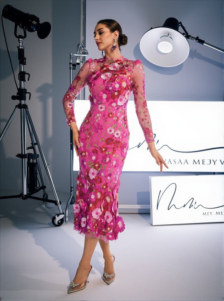 Amara Long Sleeve Embroidered Midi Dress In Hot Pink