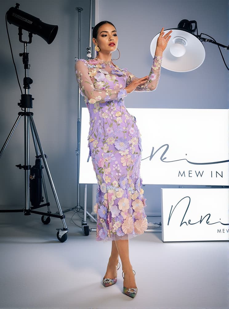 Amara Long Sleeve Embroidered Midi Dress In Purple