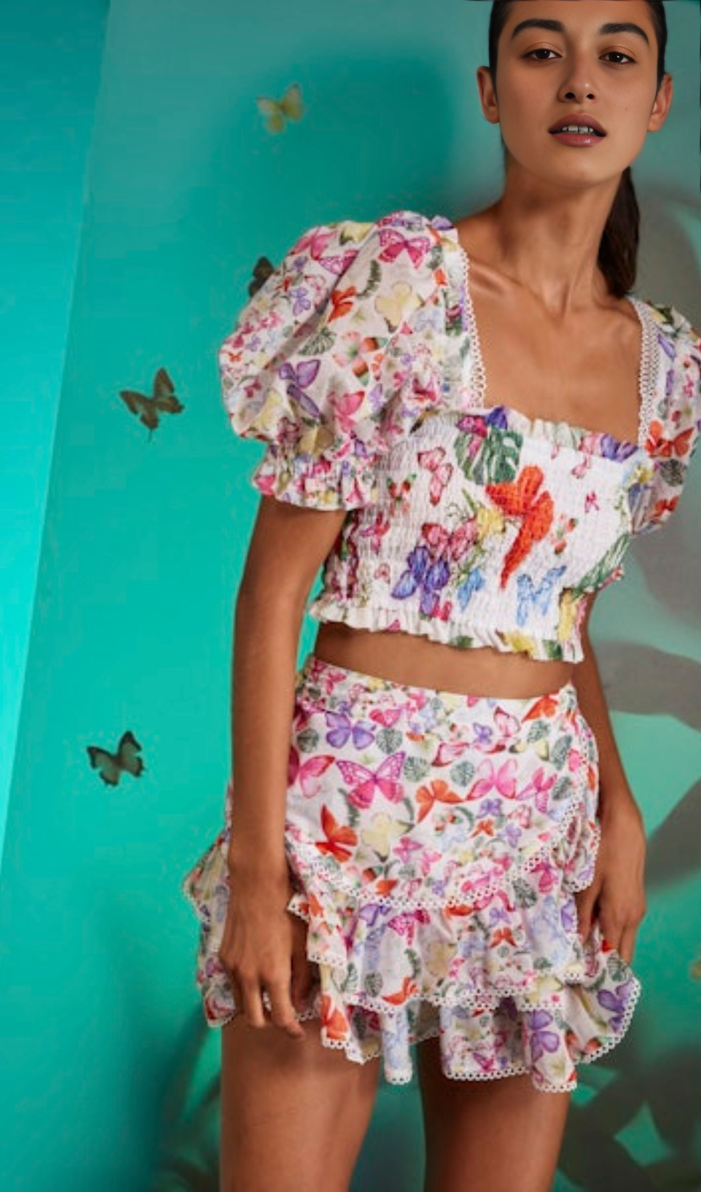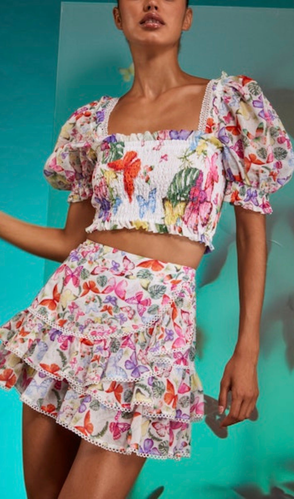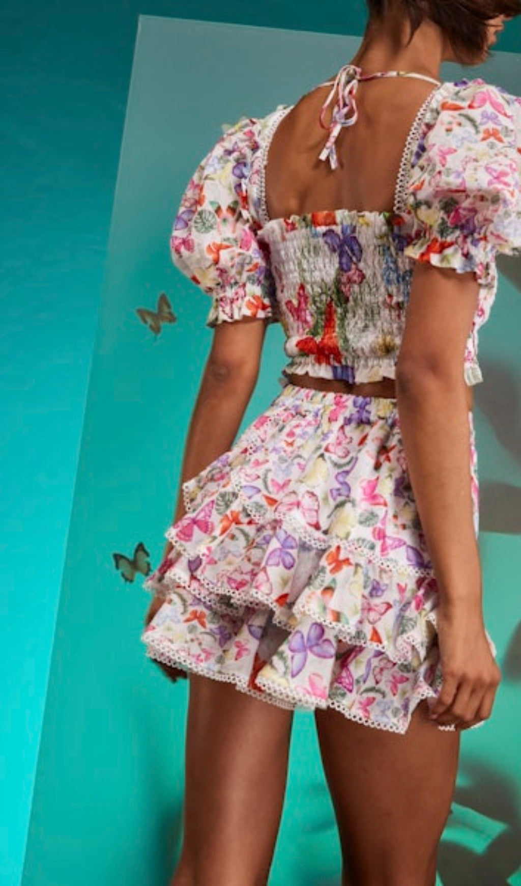 The Amayeta mini skirt is a feminine and flattering piece. Its asymmetrical cotton ruffles adorned with geometric guipures play with the drawn lines and complement the unique hand-painted elements print.