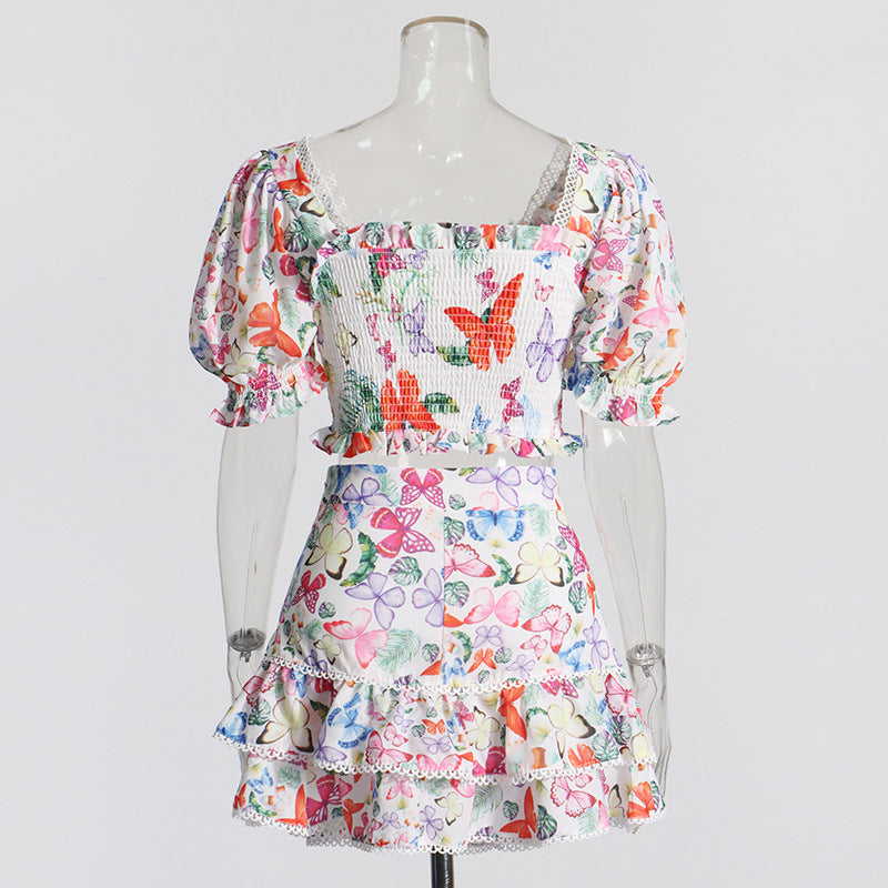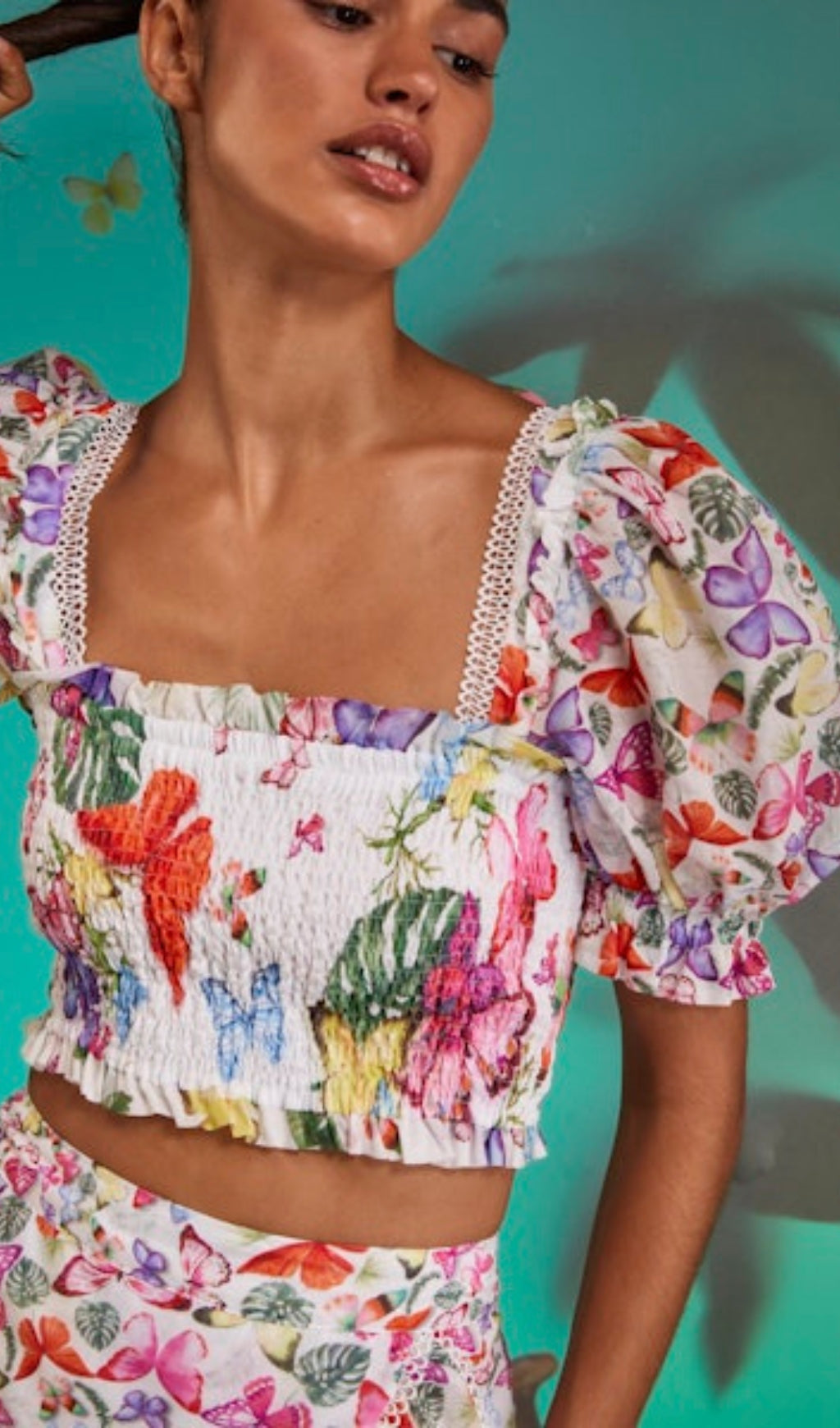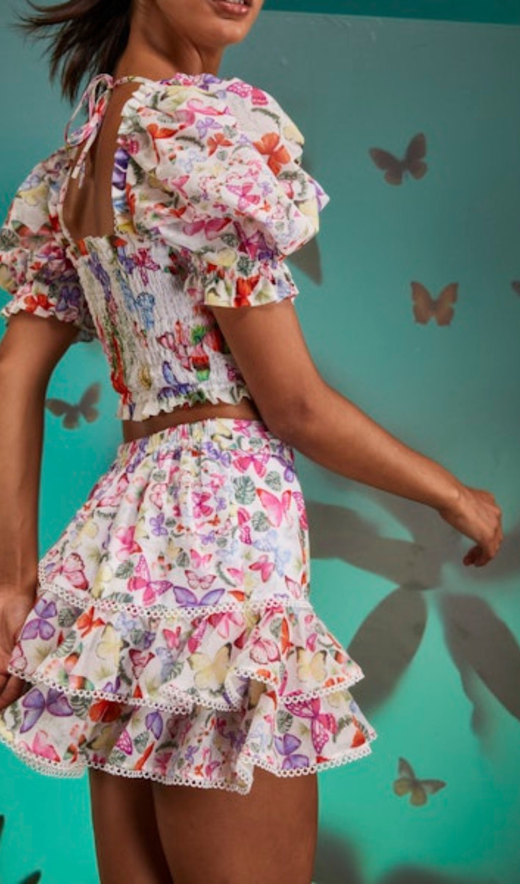 The Amayeta mini skirt is a feminine and flattering piece. Its asymmetrical cotton ruffles adorned with geometric guipures play with the drawn lines and complement the unique hand-painted elements print.