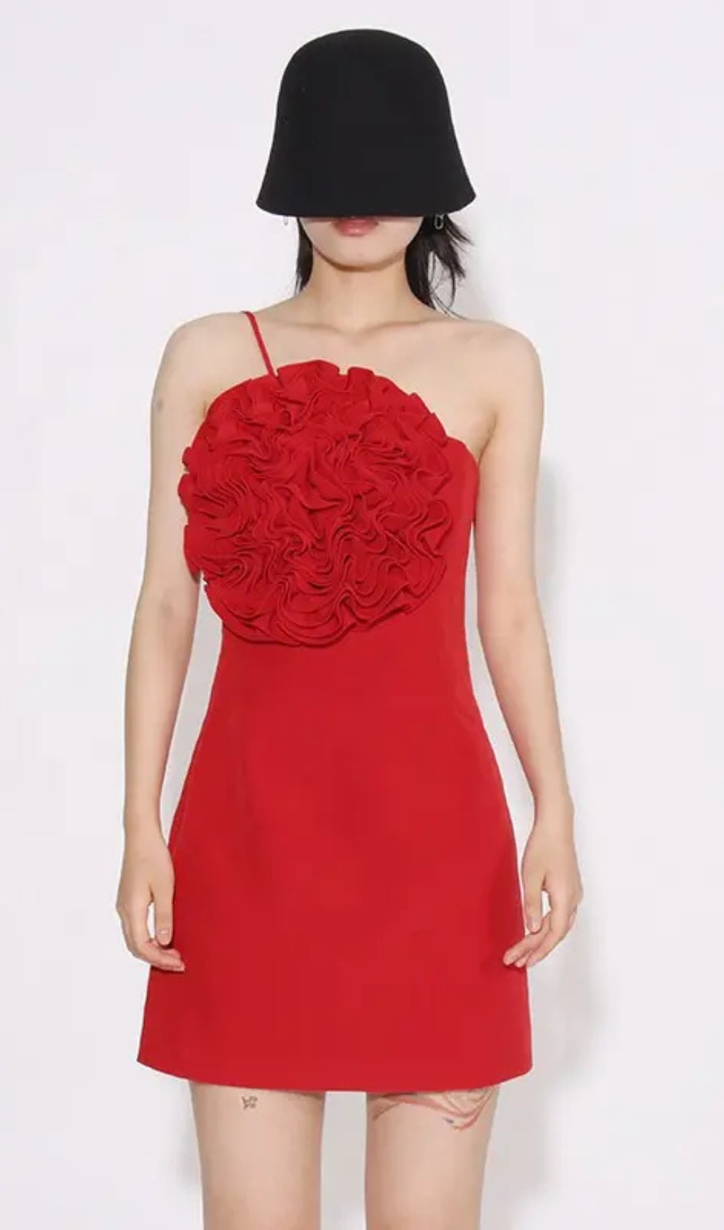 Featuring intricate floral appliqué in bold red, this dress exudes sophistication and exclusivity. The perfect statement piece for any occasion, this dress will elevate your style and leave a lasting impression.