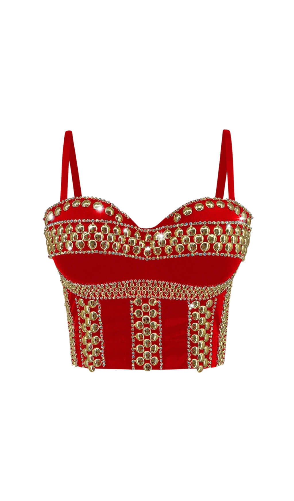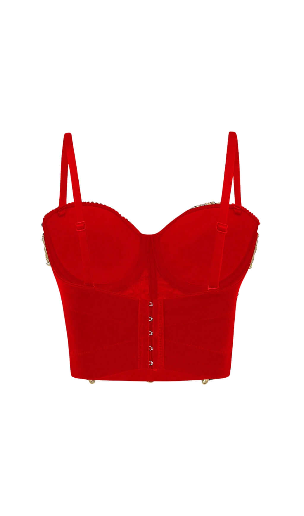 Introducing the ANALISE RED DECOR CROP TOP, a fun and stylish addition to your wardrobe. With its eye-catching design and flattering fit, this crop top is perfect for any occasion. The intricate decoration adds a unique touch to your outfit. Stand out in style with the ANALISE RED DECOR CROP TOP.