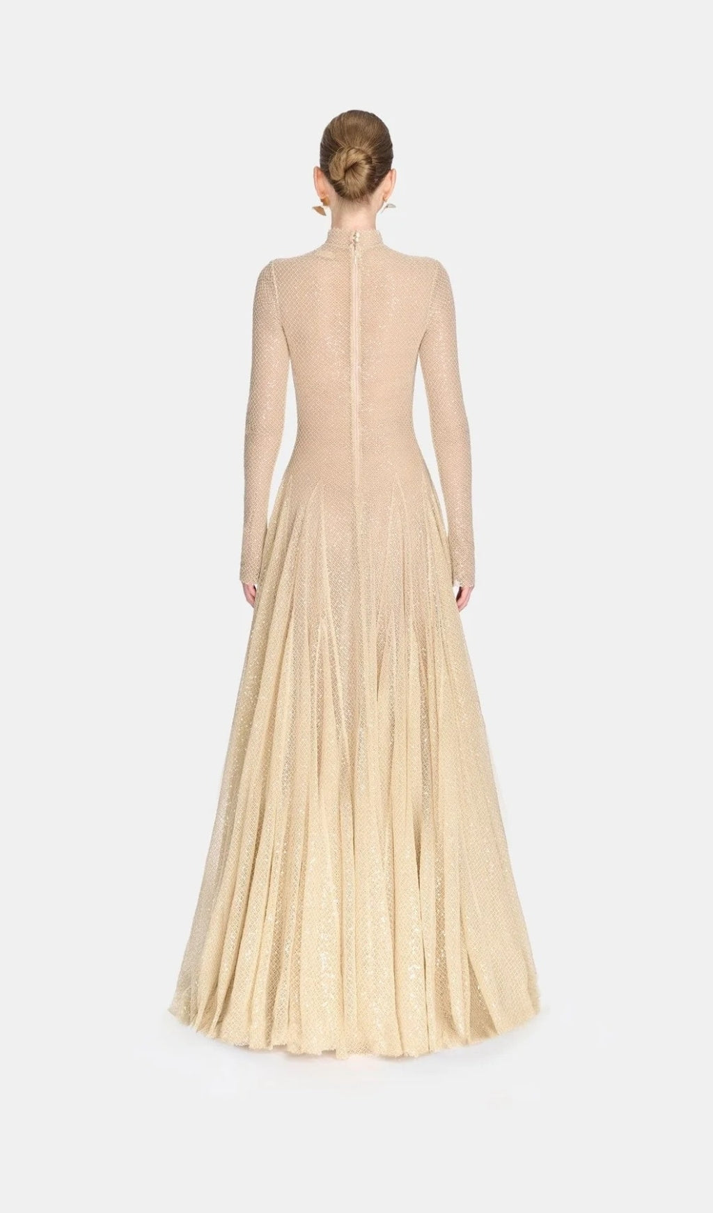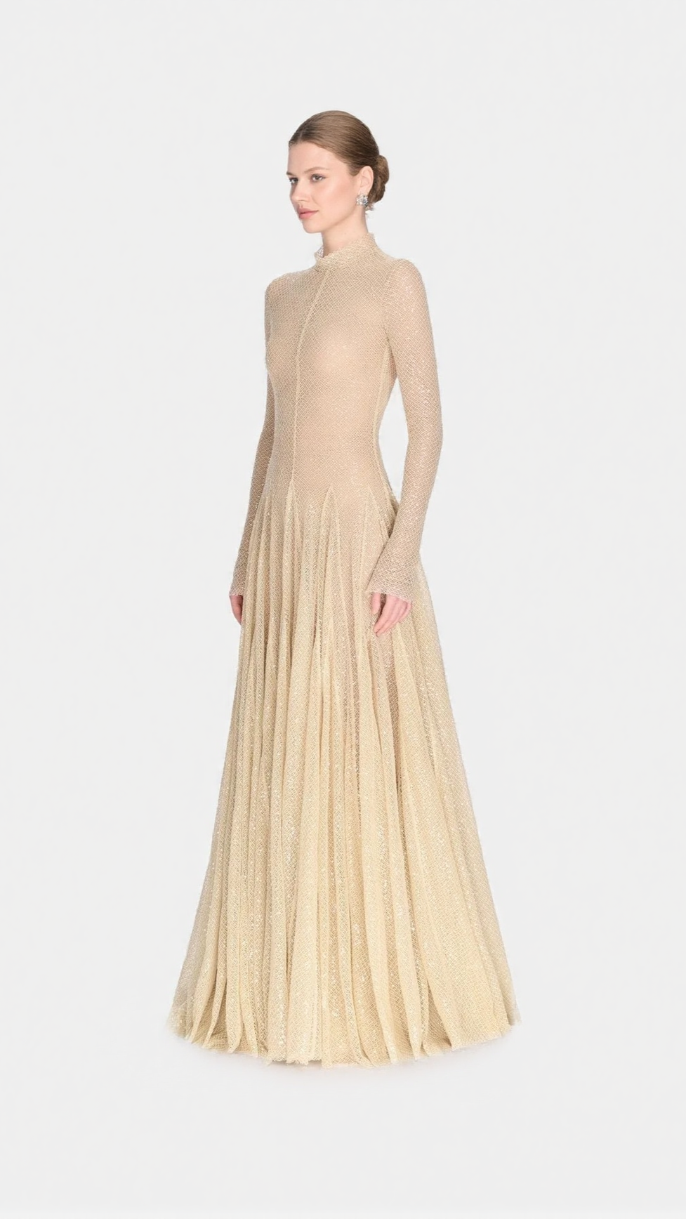 ANILA BEIGE MESH LONG SLEEVE SLIM MAXI DRESS