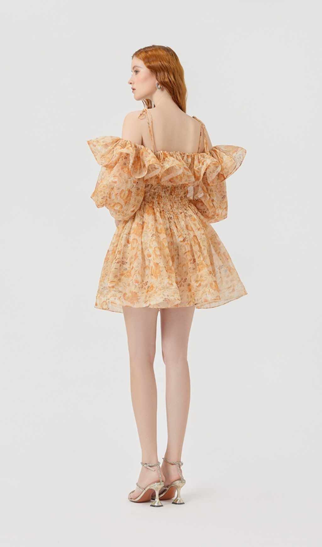 ANNA PRINTED RUFFLE TRIM MINI DRESS IN ORANGE