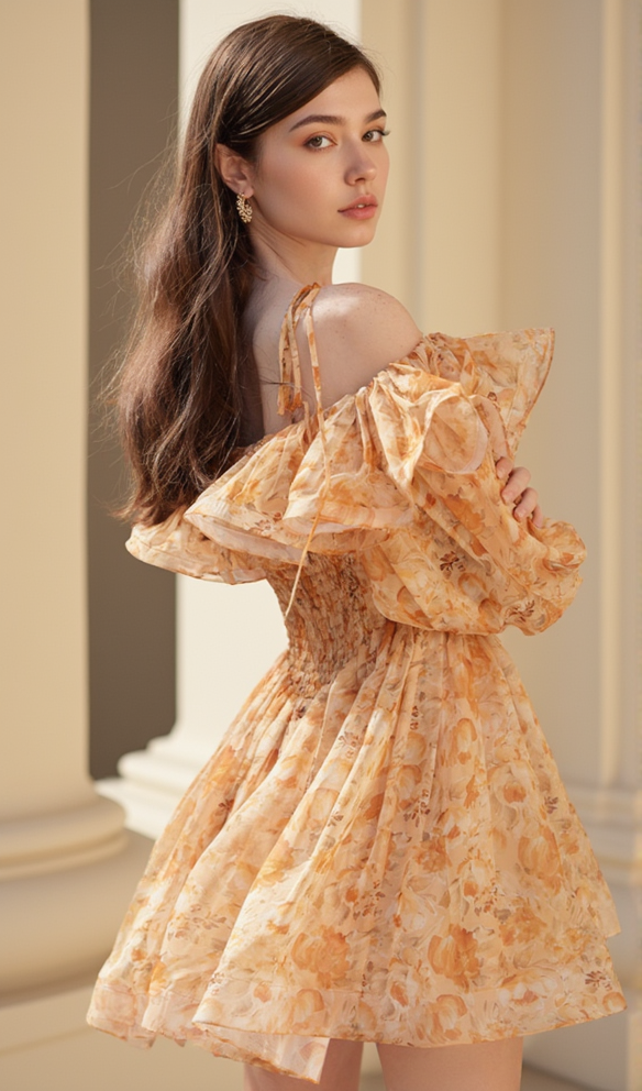 Made with luxurious fabric in a stunning orange print, this dress features delicate ruffle trim for an added touch of sophistication. Perfect for any occasion, this dress seamlessly combines elegance and style.