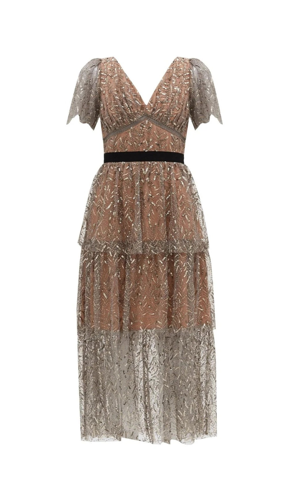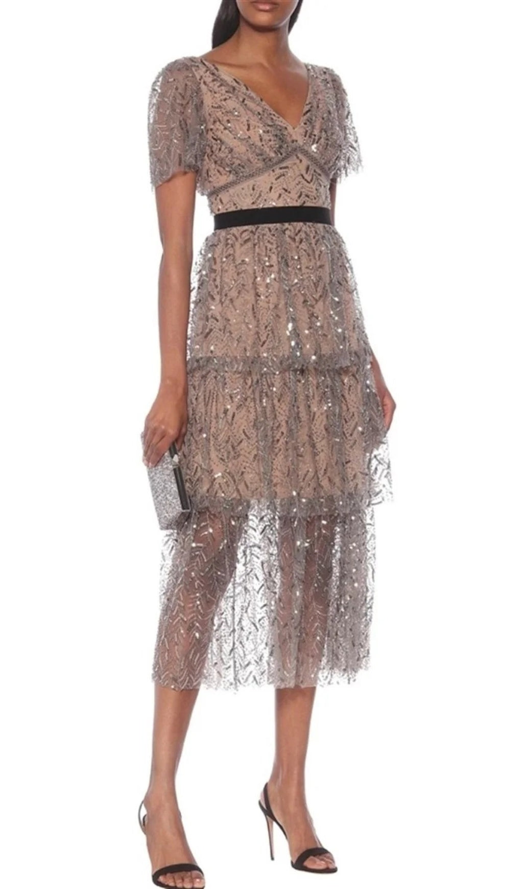 Cut from light grey leaf sequin mesh this dress is designed with a v-neckline, elastic grosgrain waistband and falls to a tiered midi skirt. This style is lined.