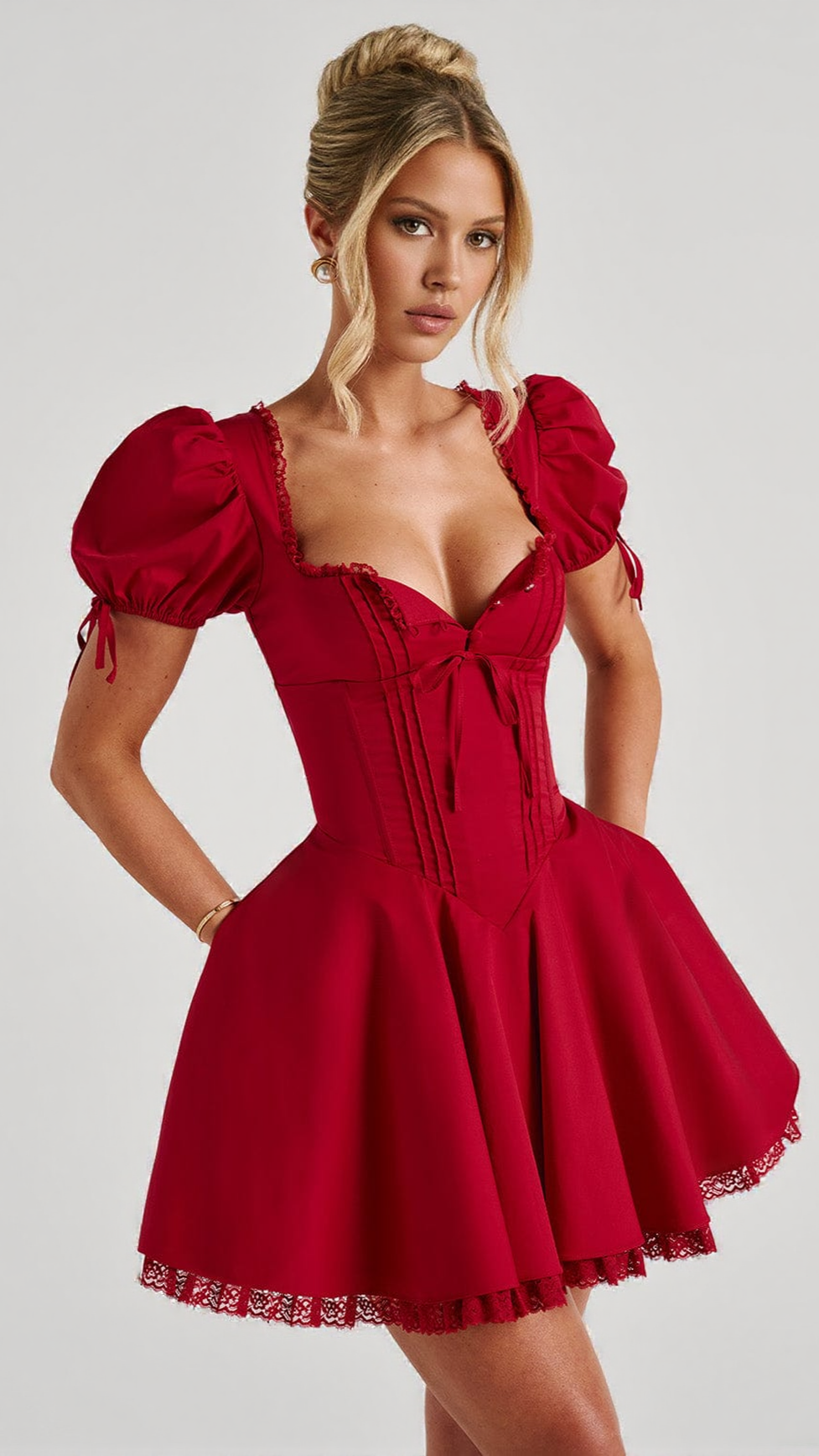 Turn heads in the flirty and romantic Annie Mini Dress. This sundress is all about delicate details, from the lace trim around the neckline to the pintuck accents on the bodice and bust. Dainty ties add a playful charm to the underbust and puff sleeves, while the lace-up back and V-shaped bodice create a flattering silhouette. It’s perfect for sunny picnics, brunch dates and beyond. The full skirt, complete with a peekaboo lace-trim hem, adds a touch of drama. Pair it with strappy sandals and a woven bag for daytime chic or dress it up with heels for a sultry night out.