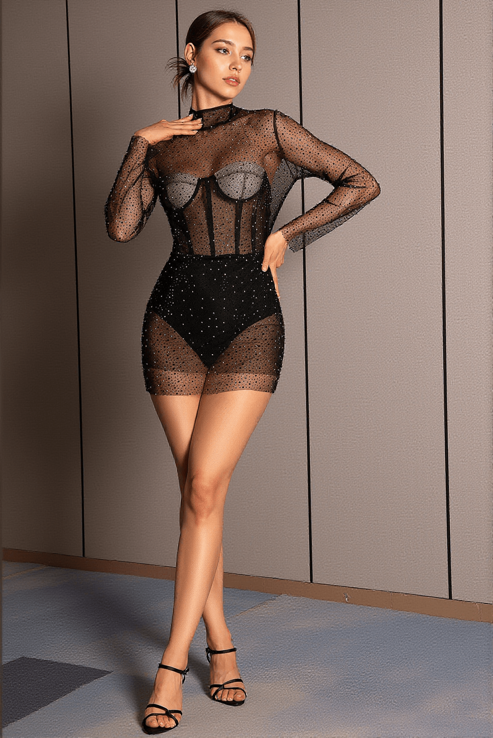 The model showcases the Anthide Mesh See-Through Rhinestone Bodysuit in a perfect blend of style and elegance, emphasizing its versatility and luxurious feel.