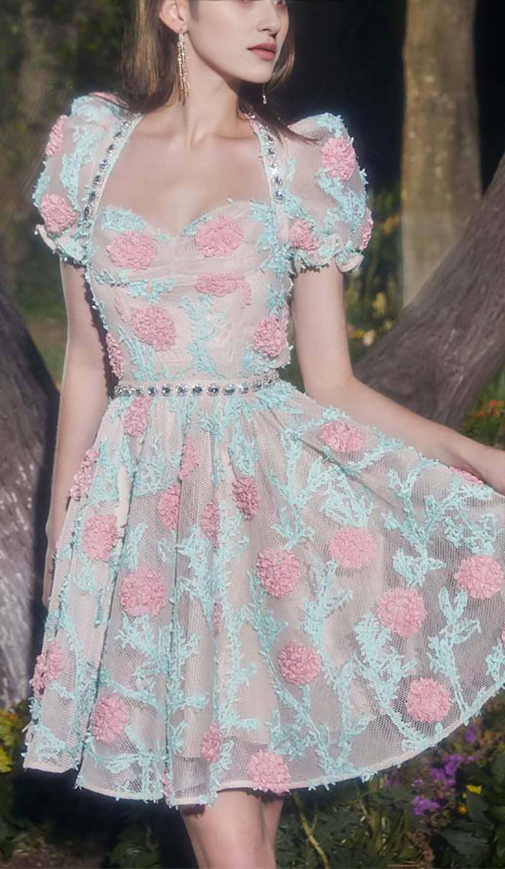 • The intricate lace embroidery and fabric appliqués create a unique and artistic elegance