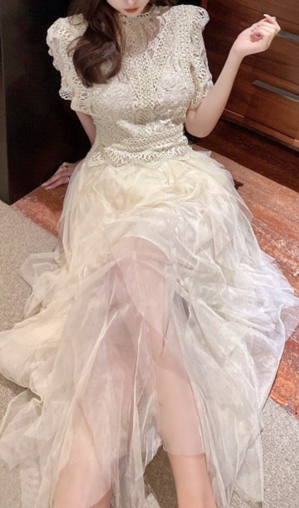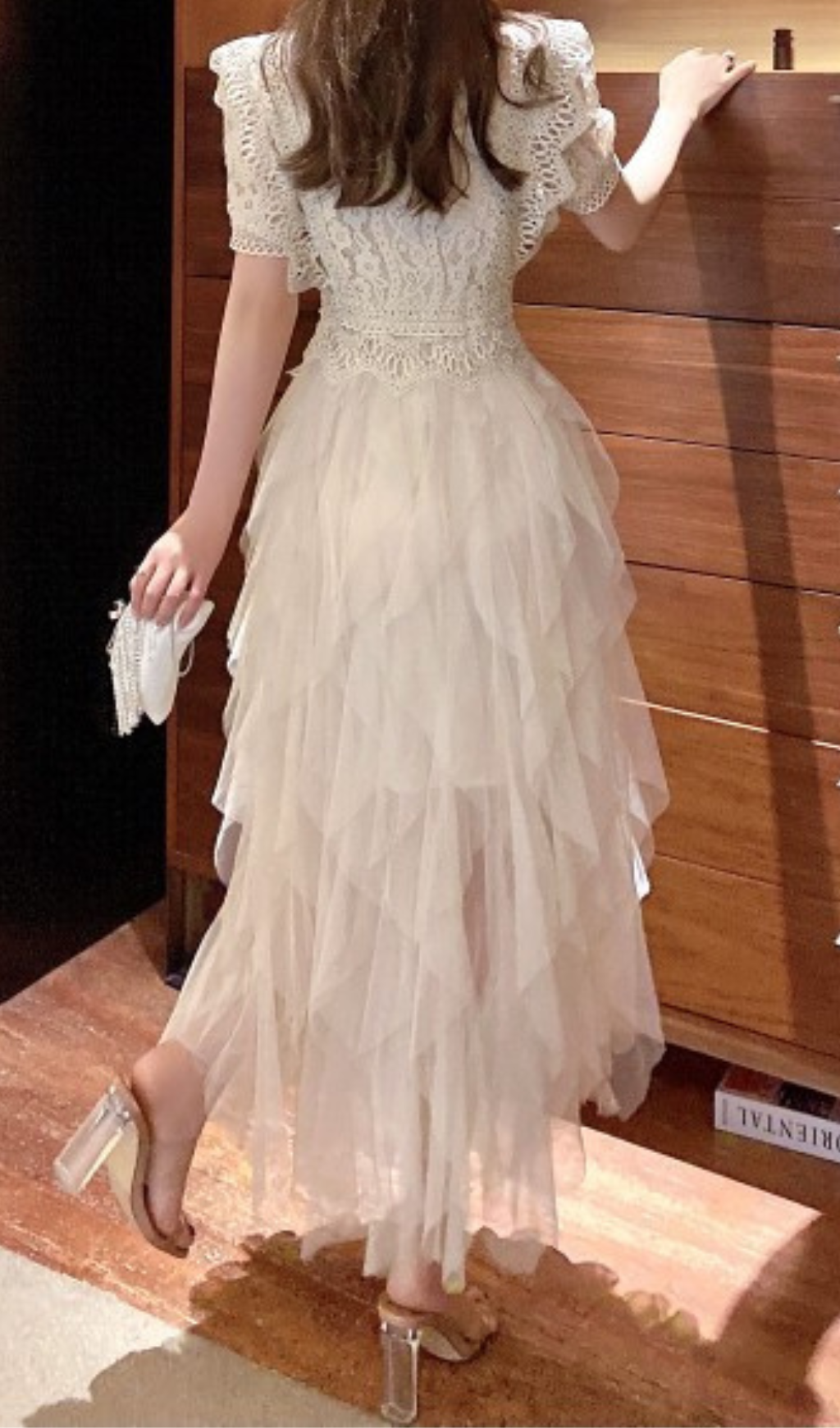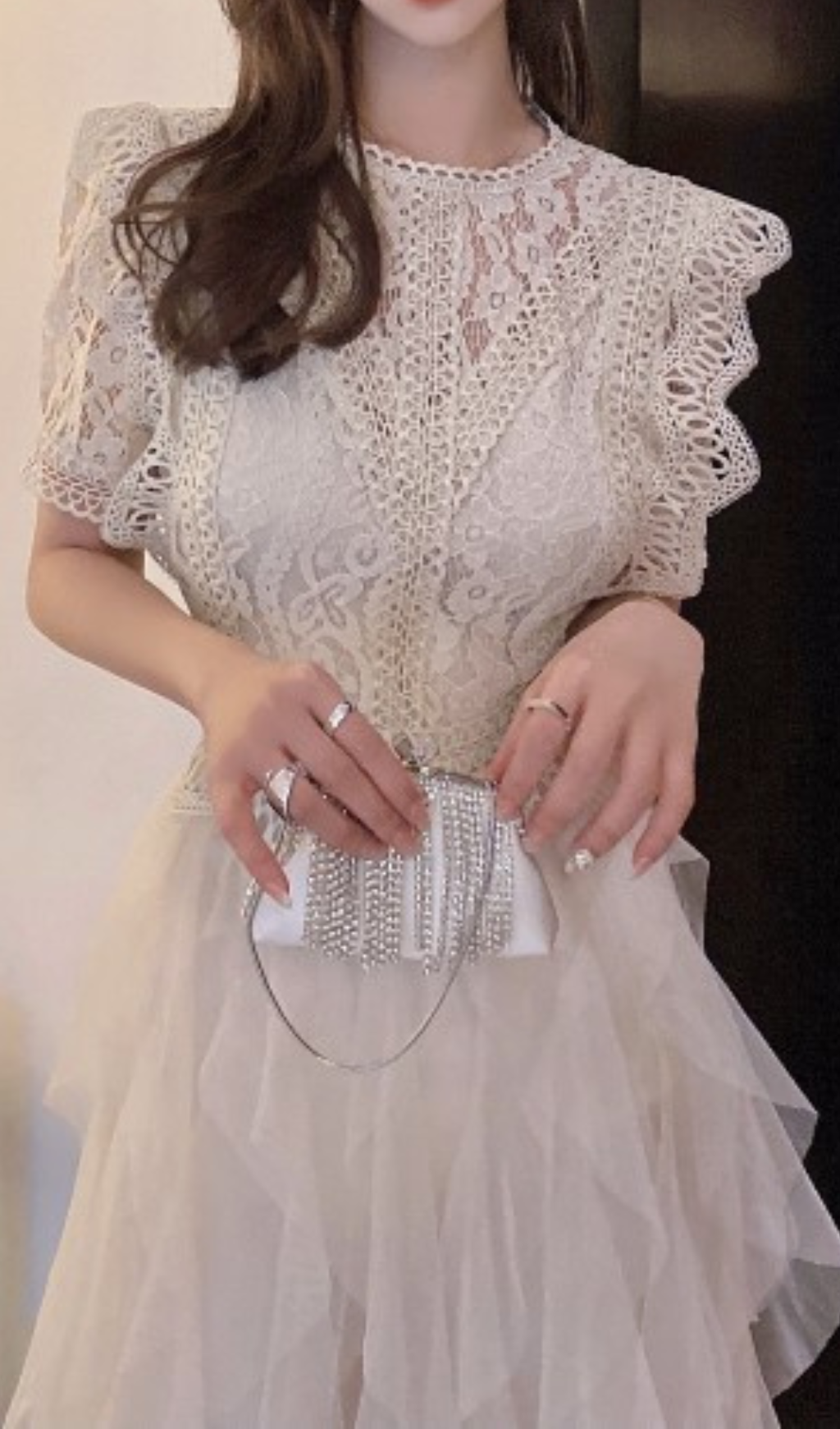 With its intricate lace detailing and unique cutouts, this dress is perfect for any occasion. Stand out and feel confident with every step you take. A must-have for any fashion-forward woman!