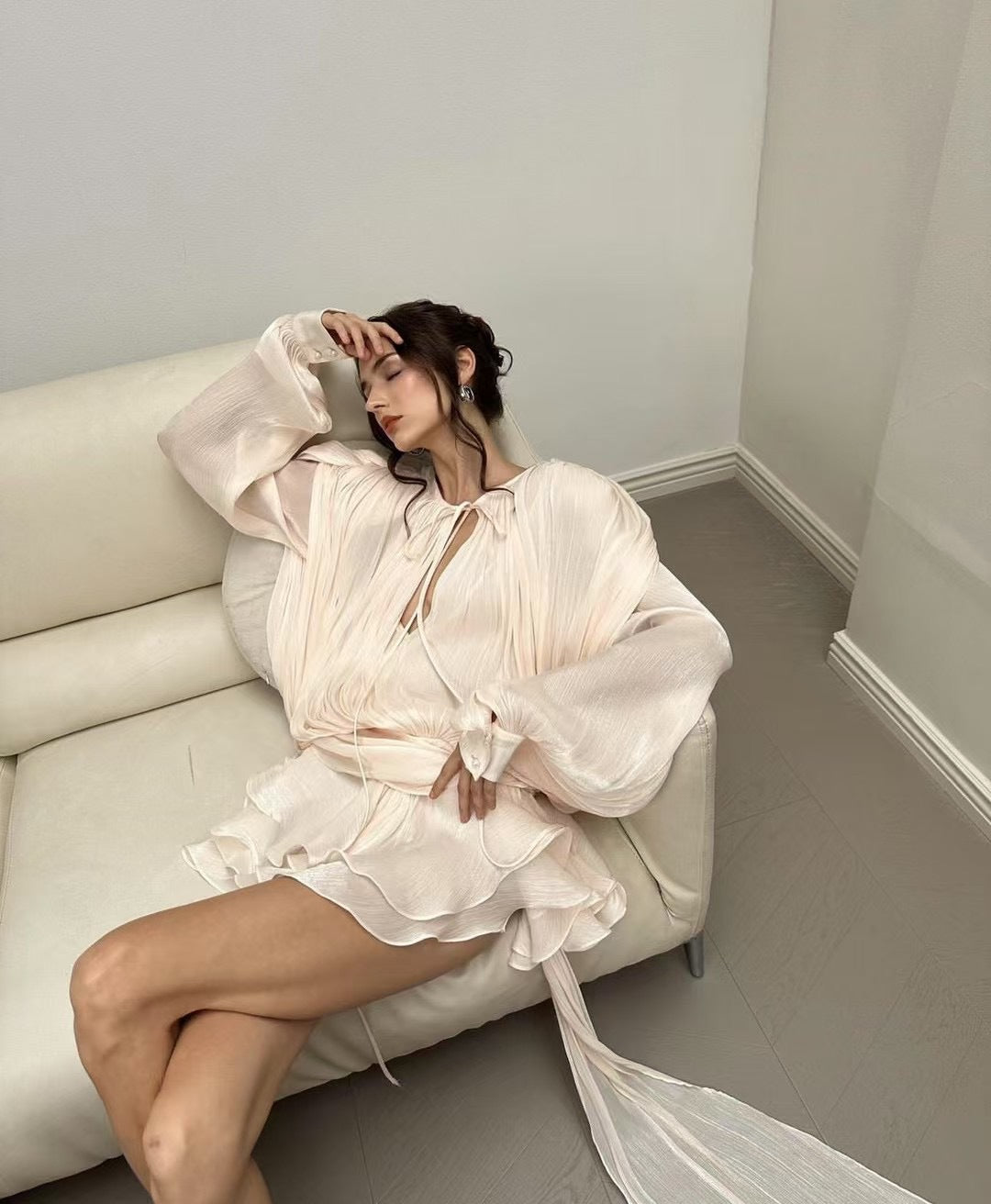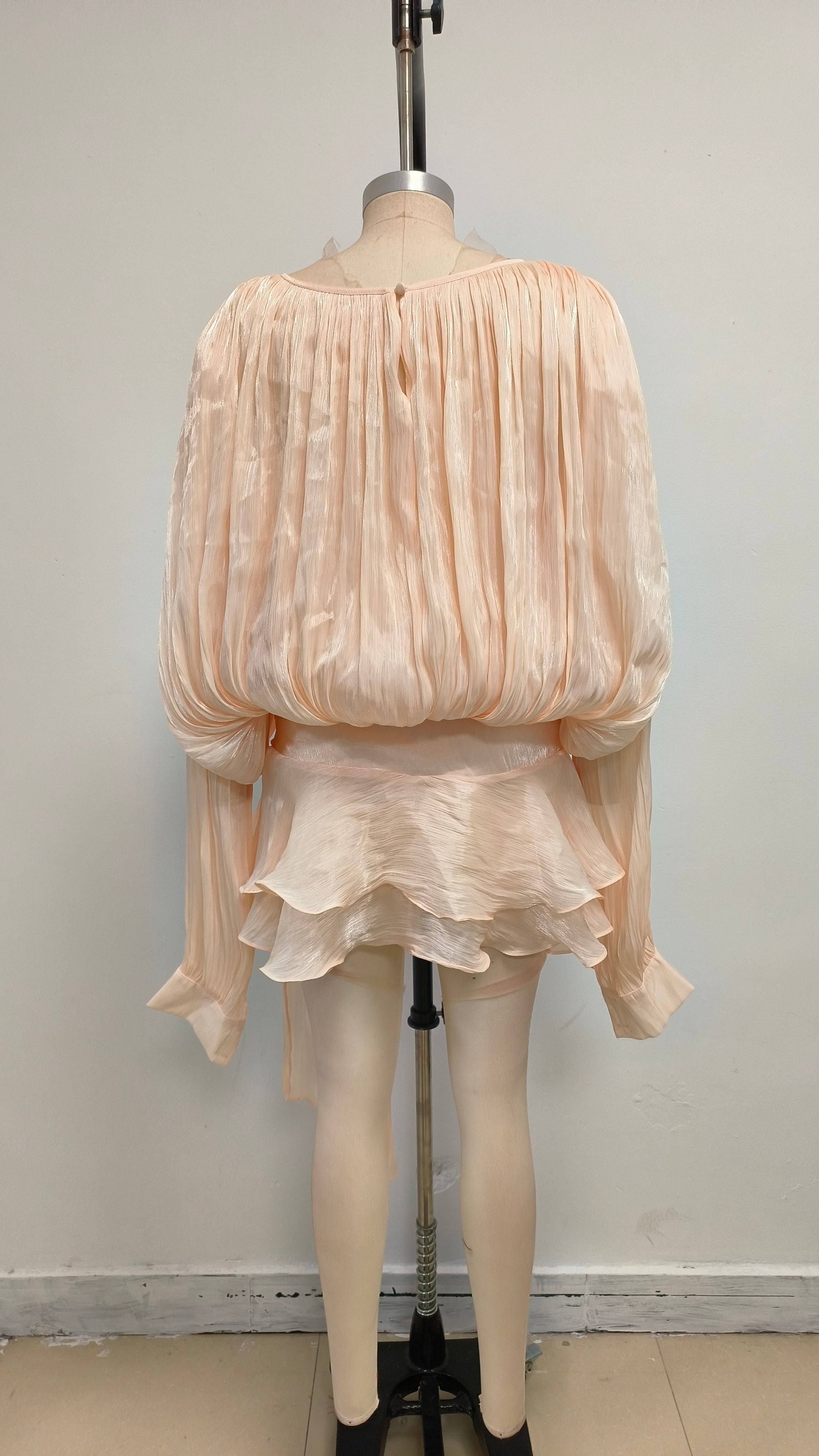 The top features loose lantern sleeves, creating a laid - back and casual vibe. There is a tie decoration at the round neckline, which can adjust the size of the neckline and add a touch of detail. The pleated treatment enhances the three - dimensionality and layering of the garment.