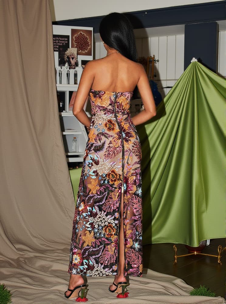 Arbor Strapless Floral Sequin Embroidered Maxi Dress