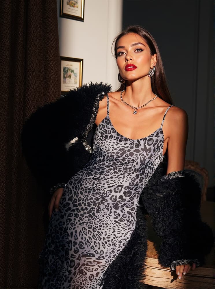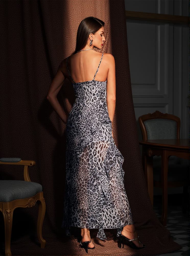 Indulge in the wild and elegant style of the Archibald Spaghetti Leopard Ruffle Maxi Dress. With its fierce leopard pattern and delicate spaghetti straps, this dress exudes confidence and femininity. The flowy ruffle detailing adds a touch of romance, making it the perfect choice for any special occasion. Unleash your inner fashionista with this stunning dress!