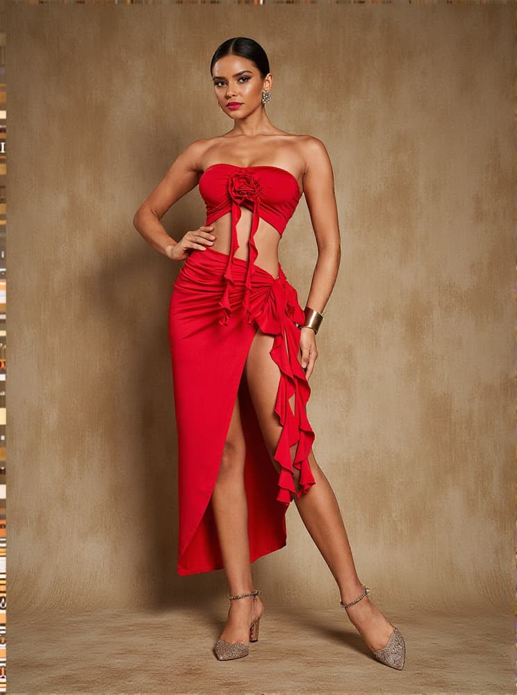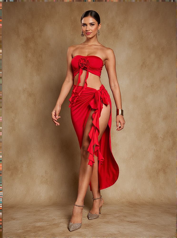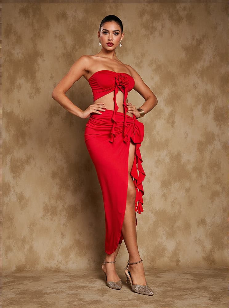 Inspired by the blooming beauty of the Arrietty Flower Draped Split Skirt Set In Red is a must-have for any fashion-forward wardrobe. The unique split design offers effortless movement and a touch of femininity, making you stand out in any occasion. Embrace your inner flower power and turn heads with this stunning set!