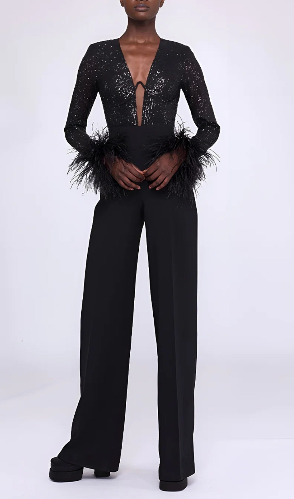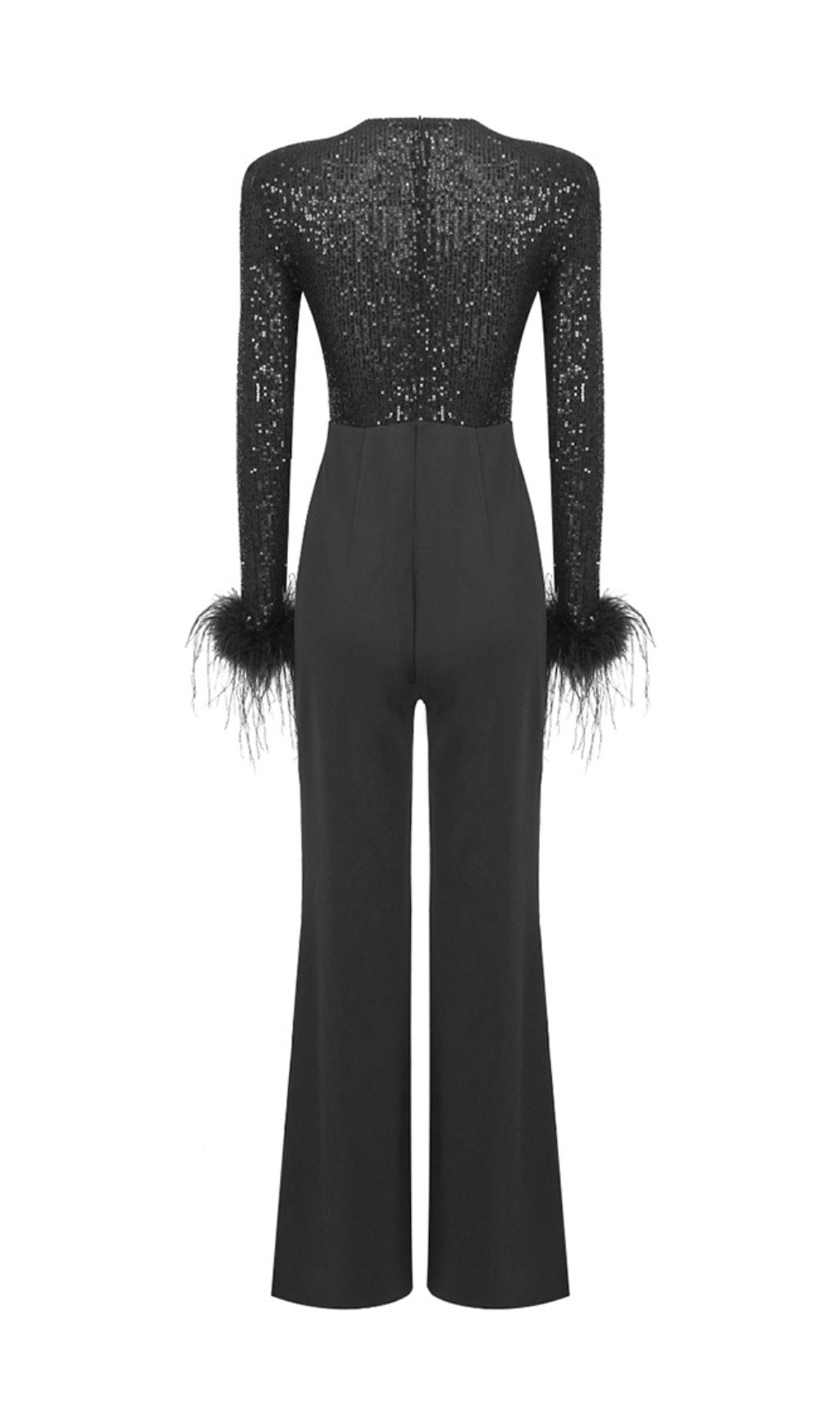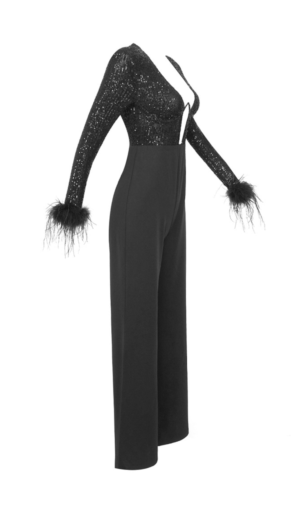 ARTY SEQUIN FEATHER JUMPSUIT