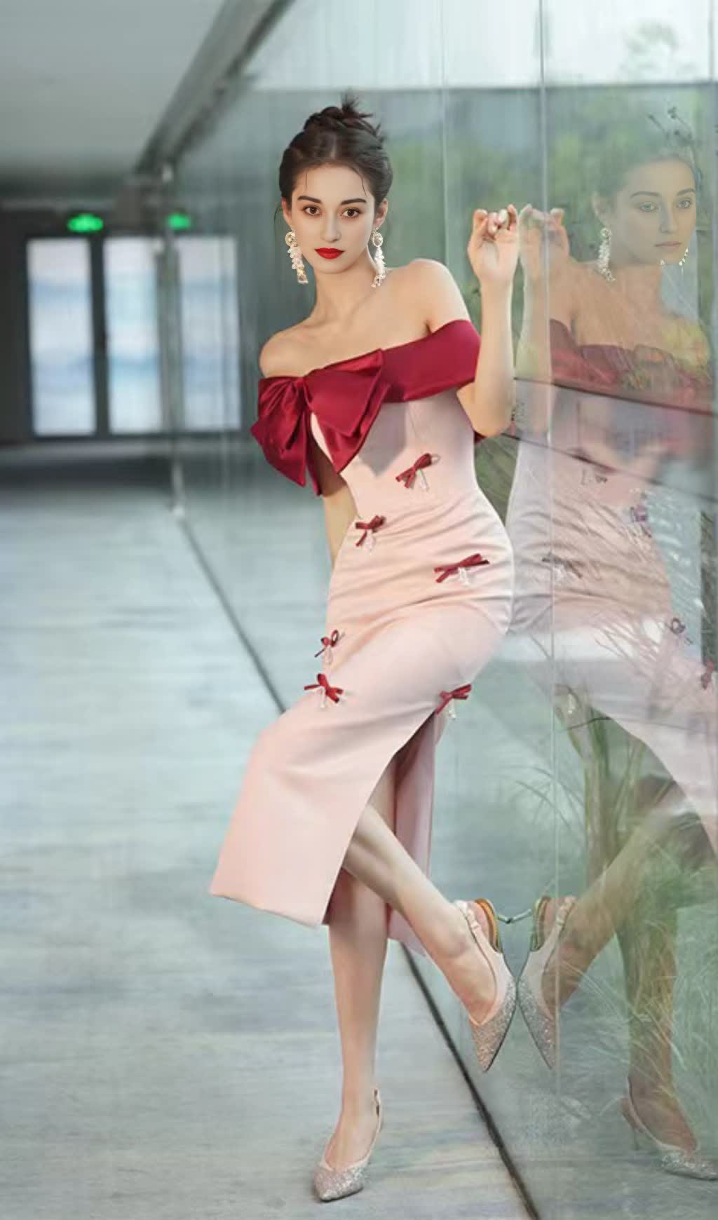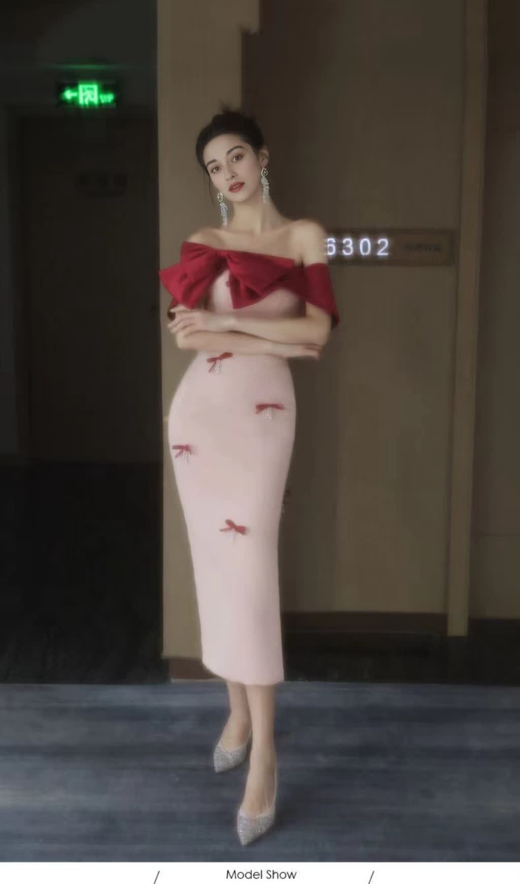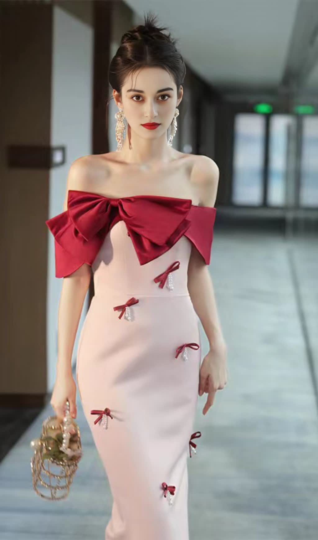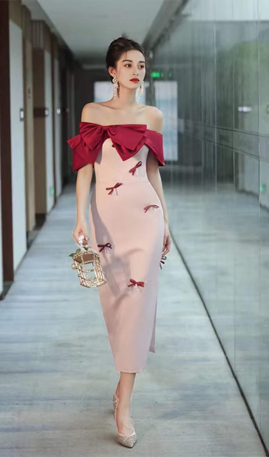 FAUX PEARL BOW MIDI DRESS IN PALE PINK