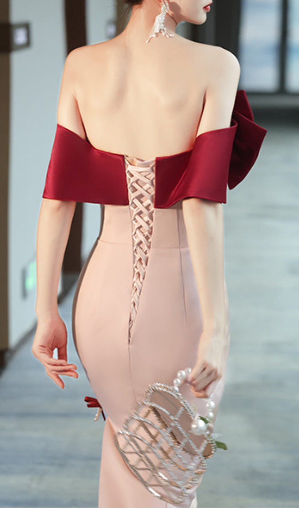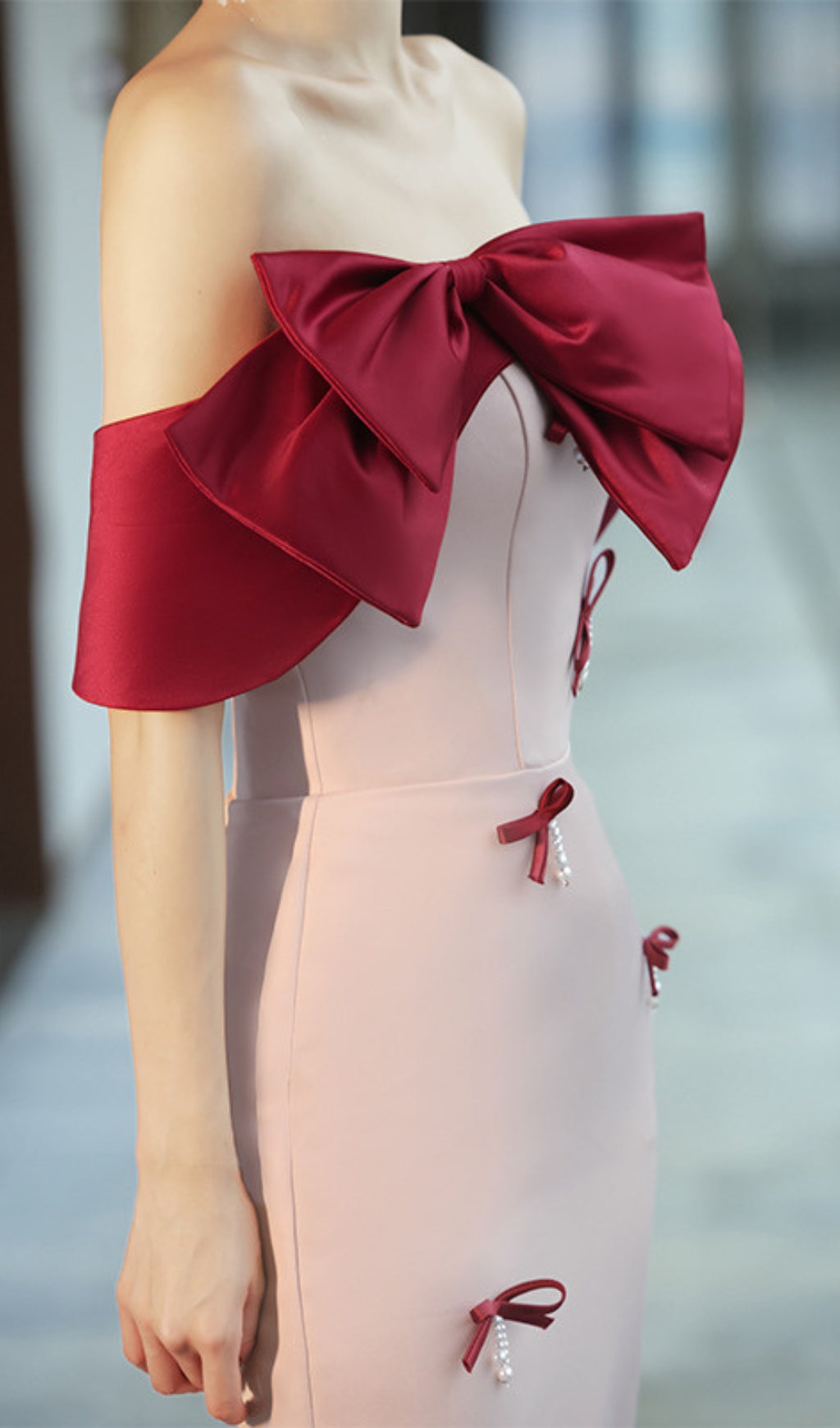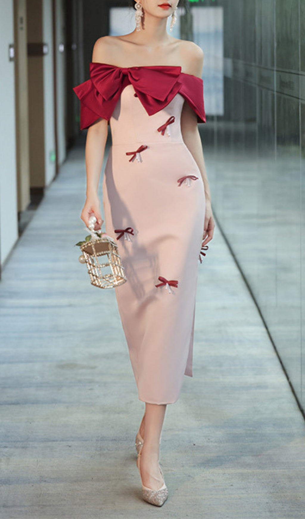 ASHLY FAUX PEARL BOW MIDI DRESS