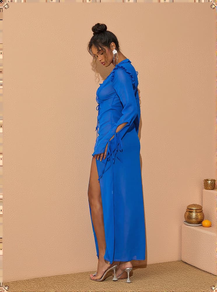 The Asuka Long Sleeve Mesh Split Maxi Dress is the perfect combination of seductiveness and stylishness. Crafted from sheer chiffon with elevated details, this flattering and sexy dress has exaggerated sleeves and long cuffs with delicate ties, a scooped neckline, and a split skirt with ruffled details that define the body. Layer with a bodysuit to show or hide as you please, and complete the look with chunky gold jewelry.