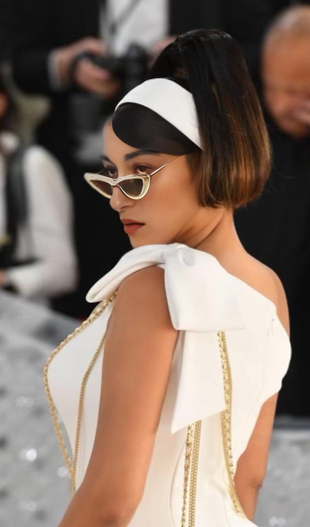 Epitomize modern elegance in this snowy white maxi dress. The slender asymmetric chains cascading down one side add a touch of sophistication, making this dress truly unique. With its breezy skirt that sways gracefully with each step, this dress offers effortless chic for any occasion.