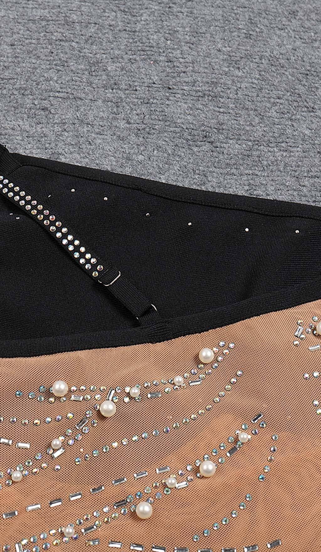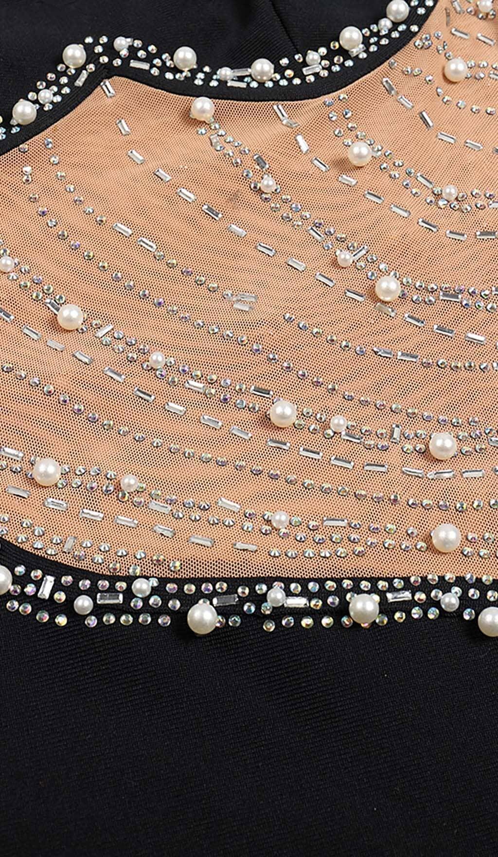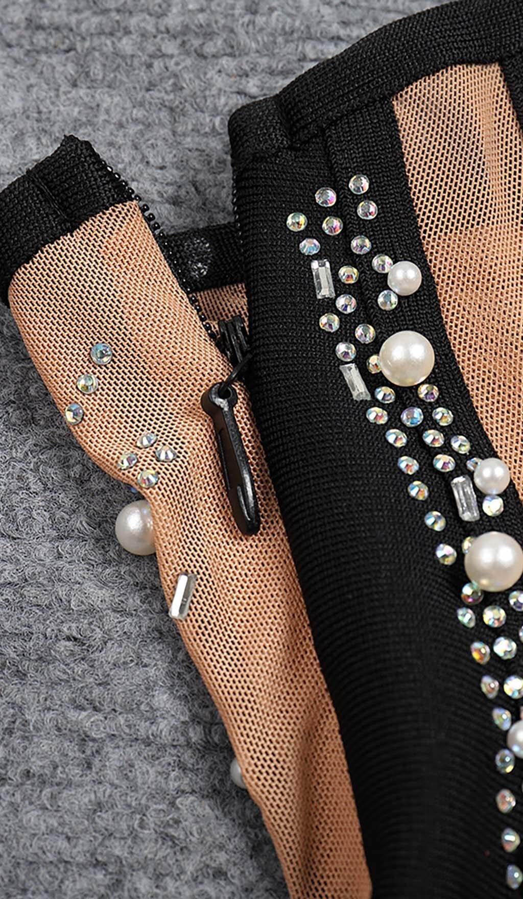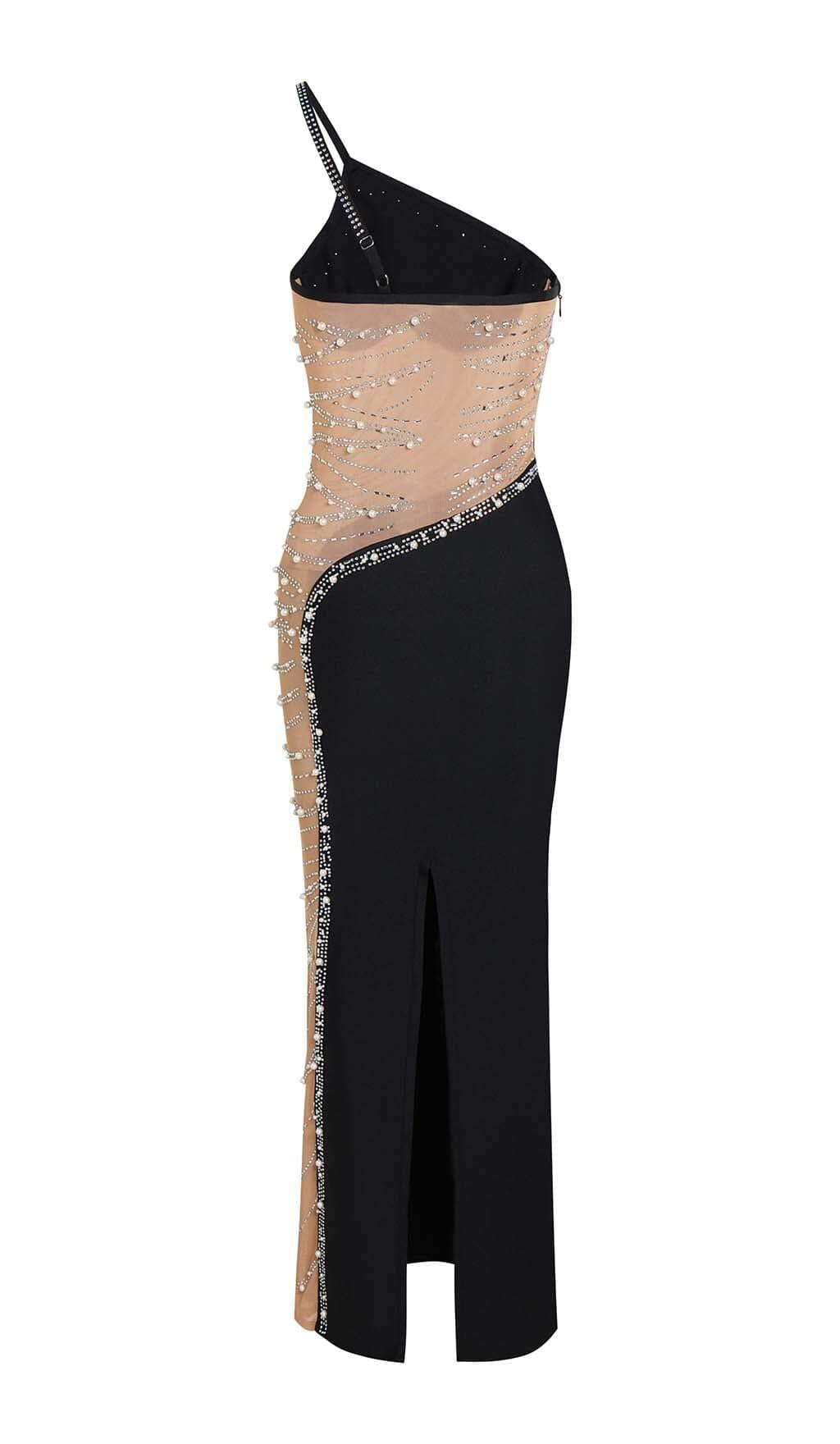 ASYMMETRIC CRYSTAL HEART MIDI DRESS IN BLACK