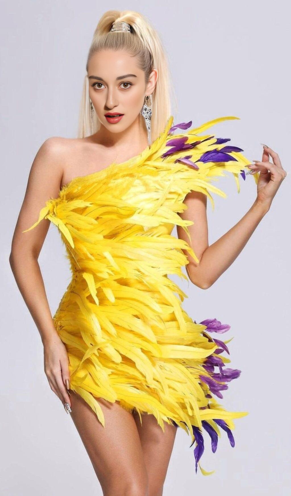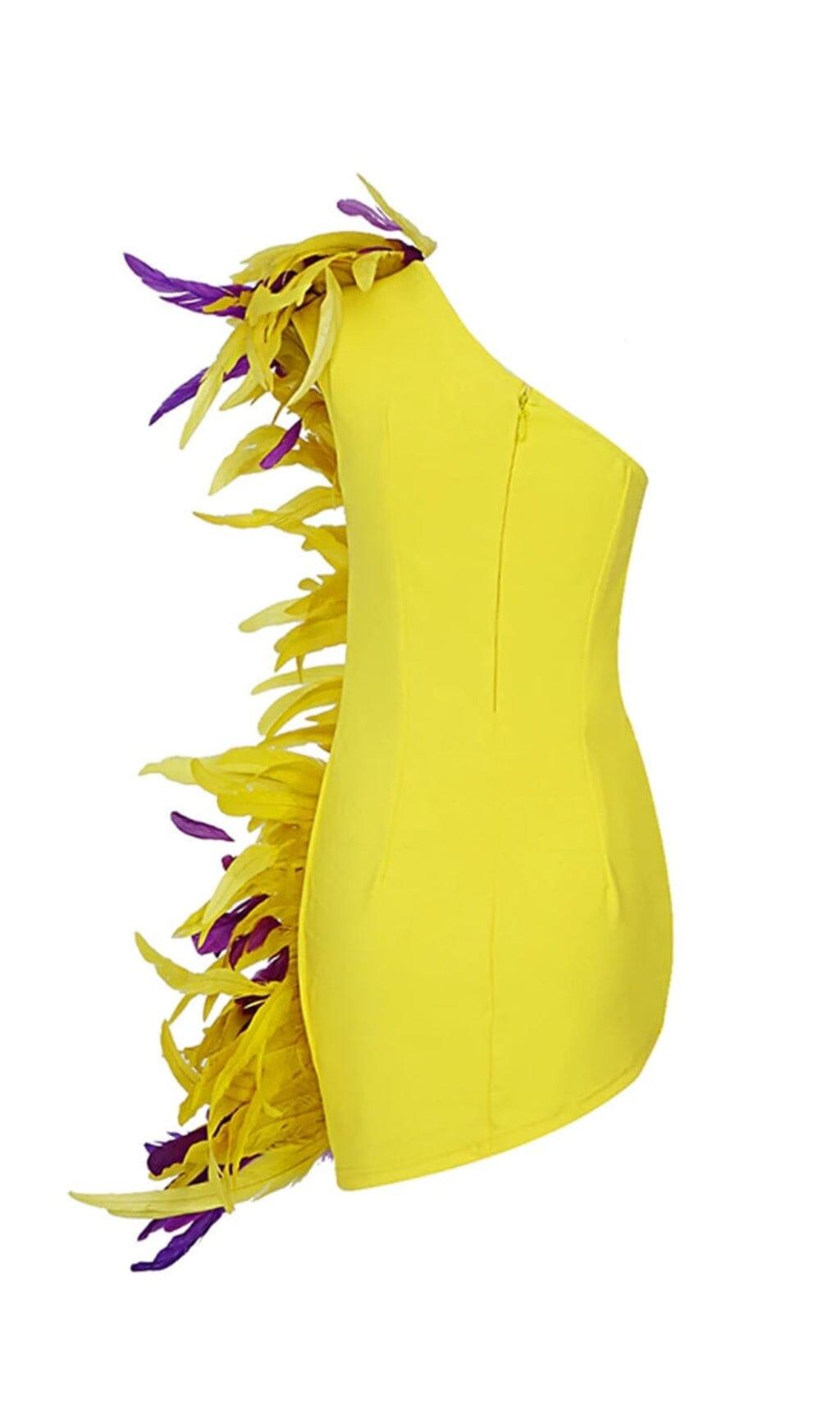 ASYMMETRIC FEATHER MINI DRESS IN YELLOW