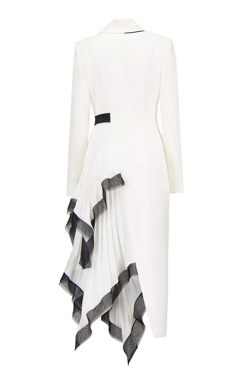The Asymmetric Pleated Ruffle Trim Blazer Dress in White is a modern and elegant addition to any wardrobe. The pleated ruffle trim adds a touch of femininity to the structured blazer silhouette, creating a sophisticated look for any occasion. Made with high-quality materials, this dress is both comfortable and stylish.